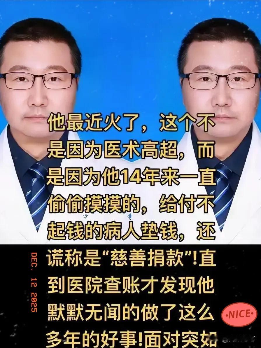 南京医生席玮这波“被查”, 真查得全网破防! 本是审计查账找问题,结果查出个14年匿名捐50多万的“傻医生”,人家当医生精打细算谋生计,他倒好,把钱全塞给看不起病的患者,还撒谎说是“基金会捐款”,就怕伤了病人的自尊。 自己日子过得紧巴巴,一家挤小房子,老婆睡衣带补丁、皮带烂了还在用,可面对困境中的患者,他从不含糊,少则一千多则五千,硬生生帮了200多位患者。 这哪是“另类”,分明是把“医者仁心”刻进了骨子里! 这年头太多人把精明当本事,把自私当常态,席玮的“傻”恰恰戳破了功利社会的虚伪——善良从不是亏本买卖,而是最珍贵的人间底色。 他的善举不只是救人,更唤醒了大家对纯粹善意的向往,还带动同事、受助者接力行善。 你身边有没有这样“默默发光”的普通人?