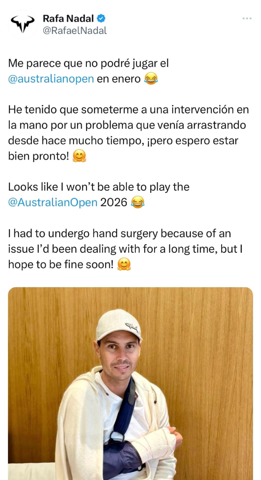 纳达尔官宣不参加明年年初的澳网比赛。 纳达尔右手刚刚做了手术,他特意在社交媒体发文,也算是给期待他的粉丝一个交代。 不过澳网本来就不是纳达尔强项,如果纳达尔能参加明年的法网,那德约科维奇估计要紧张了。