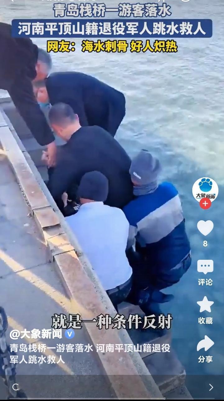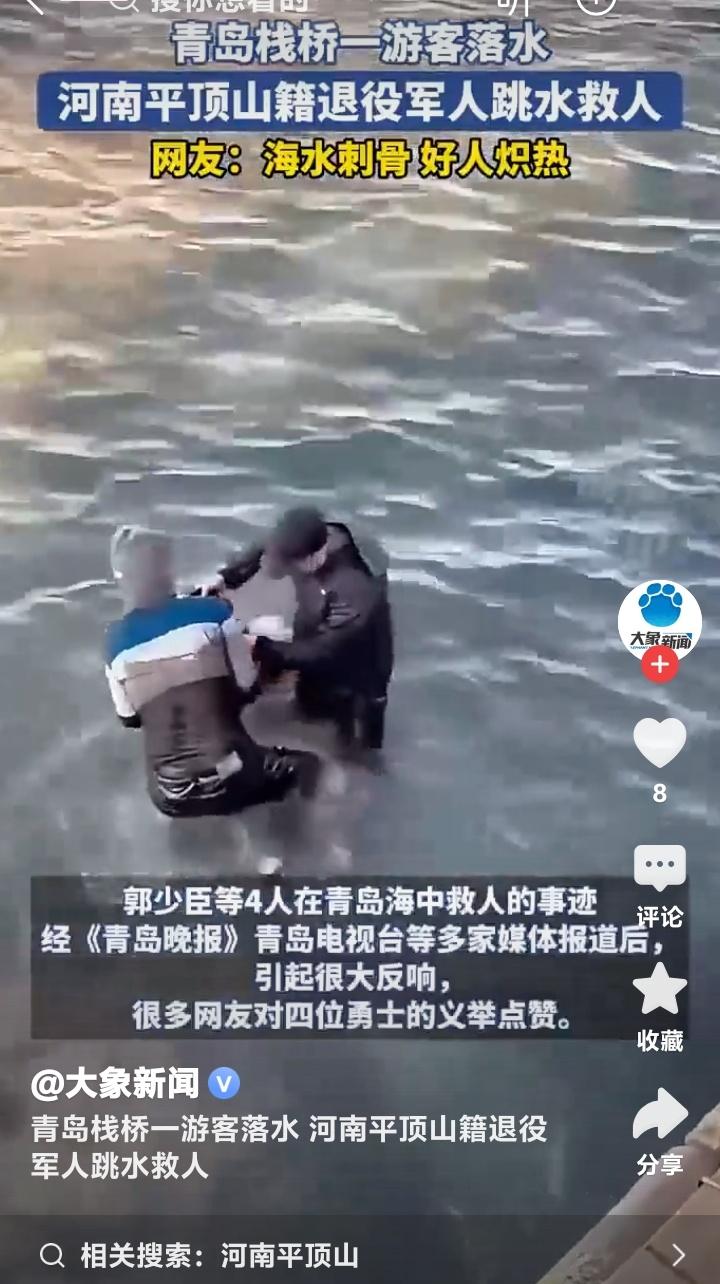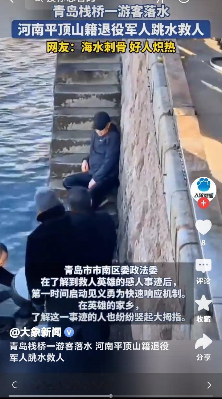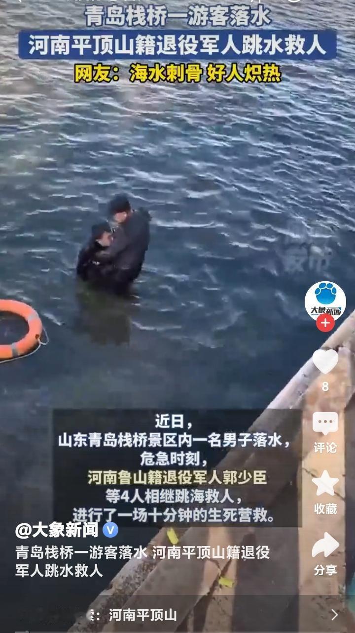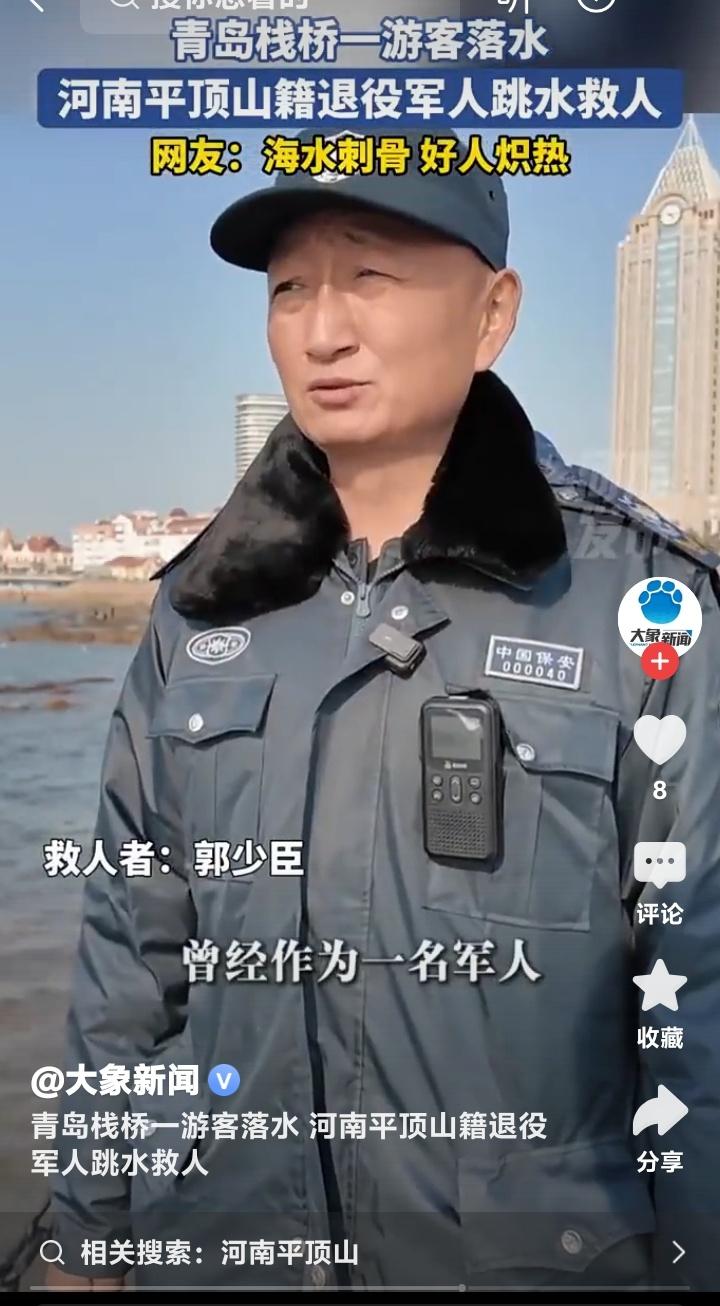 青岛栈桥生死十分钟!河南平顶山籍退役军人刺骨海水中托起生命,七旬老父含泪说出这句话 冰冷的海水淹没呼吸,礁石暗藏杀机,青岛栈桥边一名男子在深冬的海浪中沉浮。时间凝滞,围观者的惊呼刺破寒风,却见一道身影毫不犹豫纵身跃下。那不是冲动,是刻在骨子里的本能,他叫郭少臣,一名来自河南平顶山鲁山县的退役军人。 海水究竟有多冷?那是深入骨髓的刺痛,足以让常人瞬间痉挛。但郭少臣感觉不到,或者说顾不上感觉。二十年的军旅生涯,将“冲锋”二字锻进了他的灵魂。那一刻,没有权衡利弊,没有犹豫迟疑,脑海里只有一个炽热的念头:救人!那不仅仅是一个陌生人,那是一条鲜活的生命。 随后,又有三位勇士接连跳入海中。素不相识的四个人,在刺骨的海水里结成最牢固的生命同盟。他们托起的,是一个身高超过一米八的昏迷男子,更是一个家庭的完整与希望。十分钟,在平常不过喝杯茶的时间,在那一刻却是与死神的激烈拔河。 当落水者被成功救上岸,救护车的鸣笛声响起,四位英雄却悄然转身,带着一身湿透的冰冷,默默消失在人群里。郭少臣甚至没想过休息,只是让妻子送来一套干衣服,换上便继续奔赴自己的工作岗位。他说这是尽职尽责,可这份“平常心”,恰恰是人性中最不凡的光芒。 直到视频在网络上流传,家乡的亲人才知道他的壮举。七十多岁的老父亲郭治海,从村干部手机里看到儿子跳海的身影,心头一紧,既自豪又后怕。这位老人红了眼眶,却说出了最朴实也最动人的话:“每一条生命都很珍贵,他救人是一种责任、一种担当。作为退役军人,他应该这样。” 是啊,应该这样。简单的四个字,背后是二十年军旅熔铸的信仰,是融入血脉的善良与勇敢。郭少臣的母亲刚去世不久,他深知失去的痛楚,因而更懂守护的意义。他守护的,是另一个儿子,另一位父亲,是陌生却珍贵的“人间”。 英雄并非天生无畏,只是选择了勇敢。郭少臣事后坦言,看着礁石和寒流,现在想来也会后怕。但正是这份后怕之后的坚定,更显英雄本色的真实与可贵。他不是遥远的神话,他就是我们身边那个沉默的邻居,那个尽责的保安,那个母亲的儿子,那个在关键时刻会为你挺身而出的普通人。 青岛市市南区委政法委迅速启动见义勇为确认程序,这是对义举最及时的褒扬。而在千里之外的河南鲁山老家,母校以他为荣,乡邻以他为傲。他种下的善良种子,早已在平凡的日子里开花,母亲生前赠予邻里的蔬菜,与他今日赠予陌生人的生命希望,一脉相承。 这个故事,没有轰轰烈烈的台词,只有冰冷海水中沸腾的热血。它让我们看到,在这个偶尔被质疑冷漠的时代,总有一些人,在危急时刻会毫不犹豫地撕开一道温暖的口子。他们用行动证明,善良是本能,勇敢是选择,而人性的光辉,永远能在最冰冷的境遇里,点燃最炙热的希望。 (来源:综合《青岛晚报》、青岛电视台、平观新闻、大象新闻等媒体报道) 青岛身边事