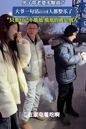 傍晚六点半 哈尔滨的冬天黑得早 路灯刚亮起来 夫妻俩吃完晚饭下楼遛弯儿 路过糖葫芦摊子 丈夫说:“给你买串山楂的?” 妻子笑着点头 自己站在两步外刷手机 摊主是位大爷 裹着军大衣搓手 看见妻子就乐了 “姑娘又来啦!今天多拿两串呗!” 转头瞥见丈夫 顺口招呼:“这位大哥也尝尝?给你家闺女带几根!” 空气静了一秒 妻子噗嗤笑出声 丈夫愣了愣 低头看看自己灰白的羽绒服 又看看妻子冻红的脸 忽然也笑了 “行啊,”他掏钱动作特别稳 “多拿几串吧。我常出差不在家 怕她馋了没人陪她来买” 语气平常得像聊天气 大爷这才看清 俩人无名指上戴着同款戒指 拍着脑门直喊“眼拙眼拙” 硬是塞了串免费的糖墩儿 说给老顾客赔不是 回去路上 妻子举着糖葫芦笑得东倒西歪 丈夫咬了口山楂 含含糊糊说: “下回我穿你那件红的 保准他喊你姐”哈尔滨冬天 哈尔滨冬季