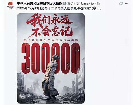 今天2025年12月13日是第十二个南京大屠杀死难者国家公祭日,中国驻日本大使馆只发了一张图和“300000”的字样,还有一位衣衫褴褛身形佝偻的受难者雕像,当时的南京人经历了什么,我们现在的中国人无法想象! 在我看来,虽然今天我驻日使馆没有发表任何字面内容,但是从这一张图的内容已经表达了我们中国人愤怒到了极点的心情!不管是衣衫褴褛身形佝偻的雕塑,还是红色的“300000”醒目字样,都在提醒和表达全世界懂得都懂的问题,因为今天是南京大屠杀死难者国家公祭日! 从高市早苗恶意挑衅,再到日本拒绝承认南京大屠杀事件,这是一步步的变本加厉的挑衅,也让今年的国家公祭日变得不但特殊而且还非常危险!中日作为近邻已经相处了上千年,我们非常清楚日本对于中国土地的贪婪和渴望,时时刻刻都想取我们而代之,大家也都心知肚明! 大家不妨打开天窗说亮话,但凡只要我们认为日本有不轨之心,那么我们一定会把日本和日本人打到好好做人,这就是我们的决心,但是到时候还有没有日本和日本人,我们就保证不了了!