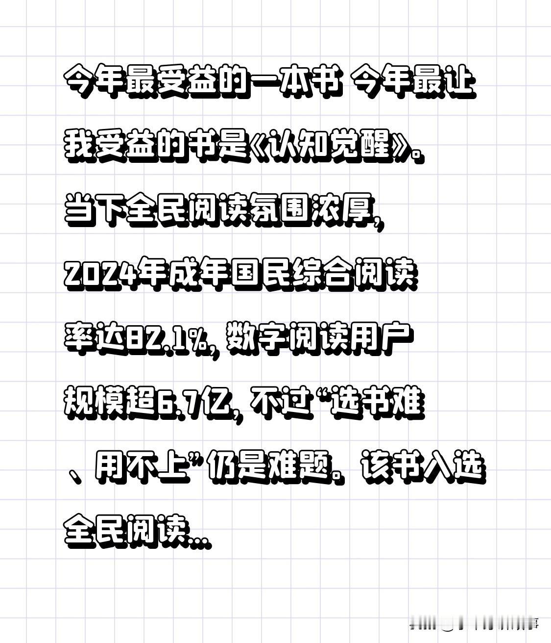 今年最受益的一本书 今年最让我受益的书是《认知觉醒》。当下全民阅读氛围浓厚,2024年成年国民综合阅读率达82.1%,数字阅读用户规模超6.7亿,不过“选书难、用不上”仍是难题。该书入选全民阅读大会双推荐书单。 它不讲空话只给办法,用易懂语言剖析认知底层逻辑,把努力无果、难以坚持等问题转化为可操作方法,是各人群的“成长指南”。我读后在学与工上找到新方向,它就是我今年的“破局利器”。