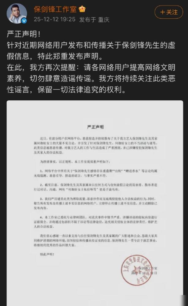 保剑锋终于坐不住了, 由影视公司出面发布声明,只是这声明,越看越令人心寒。 事情大概是这样:黄慧颐最近在直播里提到和保剑锋的一段旧情,牵扯到两人曾有长时间的恋爱经历,引发争议后,保剑锋方面通过影视公司发了声明进行回应。 先说感受吧,我第一反应不是八卦,而是替人难受。十年感情,好散就算体面了,可现在演变成互相指责,任何一方都不可能好看。 我更在意的是动机这件事。声明里把她说成“造谣”“蹭热度”,可问题是,她这些年一直安安静静生活,也没围着娱乐圈转,这种时候突然出来编故事,逻辑上确实很别扭。 再看她自己的状态。直播里多次哽咽,不像是精心设计的话术,更像是被逼到情绪失控的人在翻旧账。正常人如果不是被刺激到极限,谁愿意把最难堪的青春再摊开一次。 还有一个容易被忽略的点:她当年为这段感情做过取舍,放弃原本的事业去追随对方。值不值另说,但这种付出一旦被轻飘飘否定,换谁都会憋不住。 当然,也不排除双方记忆和立场完全不同。感情这种事,本来就没有统一版本,但把所有话都压成“谣言”,反而更容易激起反弹。 说到底,我不站谁,只觉得这事不该被简化成谁蹭谁。时间会慢慢筛出真相,但有些伤,一旦被当众否认,就真的很难再合上了。