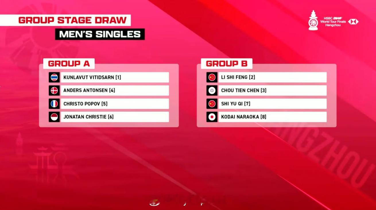 【羽联总决赛男单分组】世界羽联总决赛抽签 12月13日,2025世界羽联巡回赛总决赛分组抽签仪式在杭州举行。男单分组如下:A组:昆拉武特(泰国)、安东森(丹麦)、C-波波夫(法国)、乔纳坦(印尼)B组:李诗沣、周天成(中国台北)、石宇奇、奈良冈功大(日本)