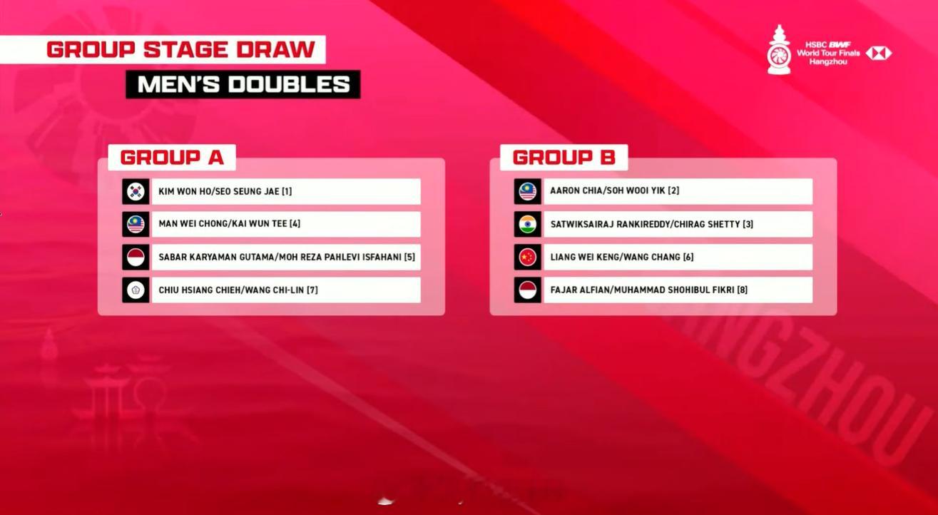 【羽联总决赛男双分组】世界羽联总决赛抽签 12月13日,2025世界羽联巡回赛总决赛分组抽签仪式在杭州举行。男双分组如下:A组:金元浩/徐承宰(韩国)、万纬聪/郑凯文(马来西亚)、古塔玛/伊斯法哈尼(印尼)、邱相榤/王齐麟(中国台北)B组:苏伟译/谢定峰(马来西亚)、兰吉雷迪/谢蒂(印度)、梁伟铿/王昶、阿尔菲安/费克里(印尼)