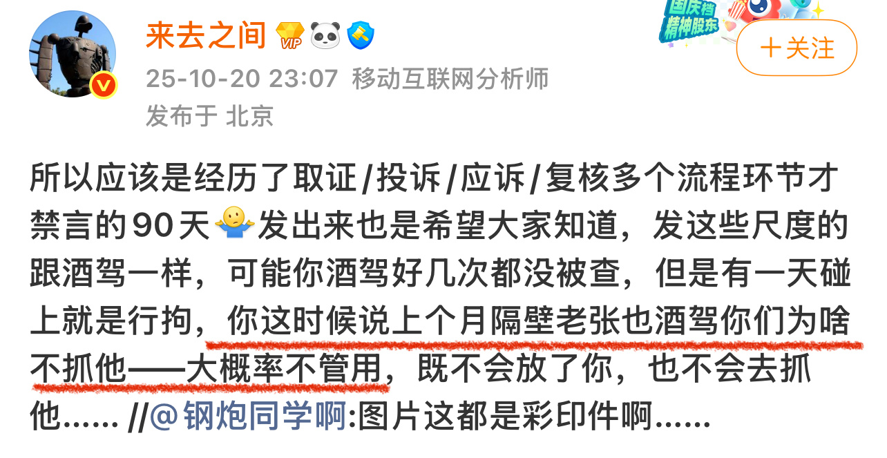 来总既然把封号类比酒驾,照你之前说的,举报隔壁一个月前酒驾没用,那这次23/24年的言论为什么现在还没上刑