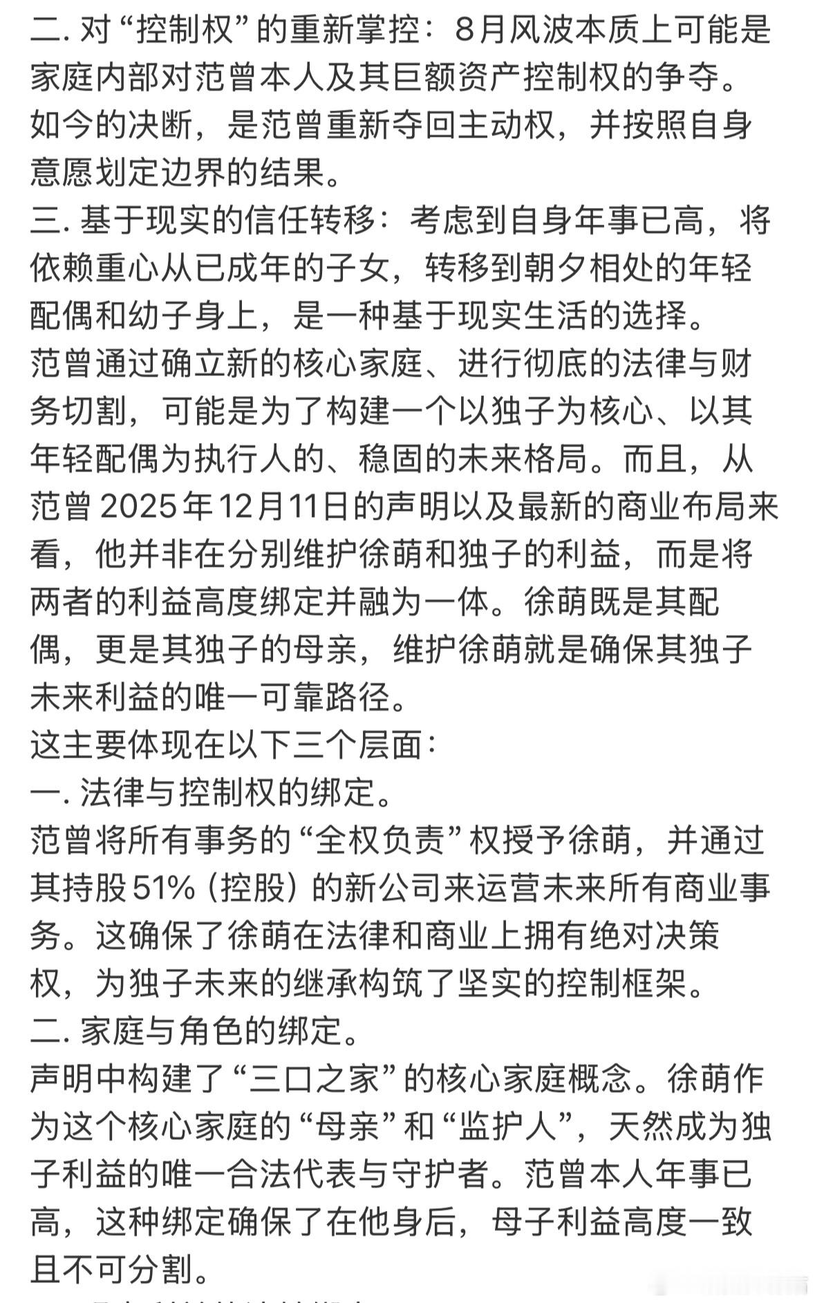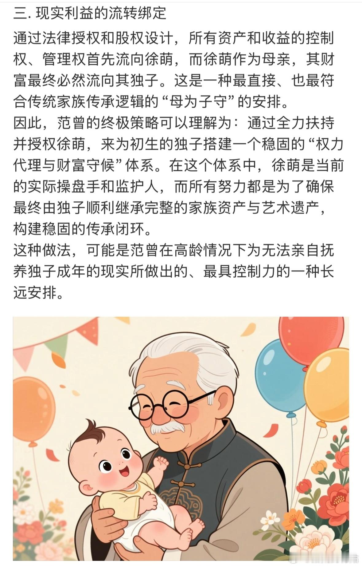 财经人士的这篇分析挺靠谱,说范曾授权太太徐萌全权负责事务,也就是把资源和未来都交给孩子母亲,确保孩子将来能顺利继承。明确家庭核心地位,也彻底切割了之前的家庭纠纷。以最稳妥的方式为至亲铺就前路,也算是做了周全考量。
