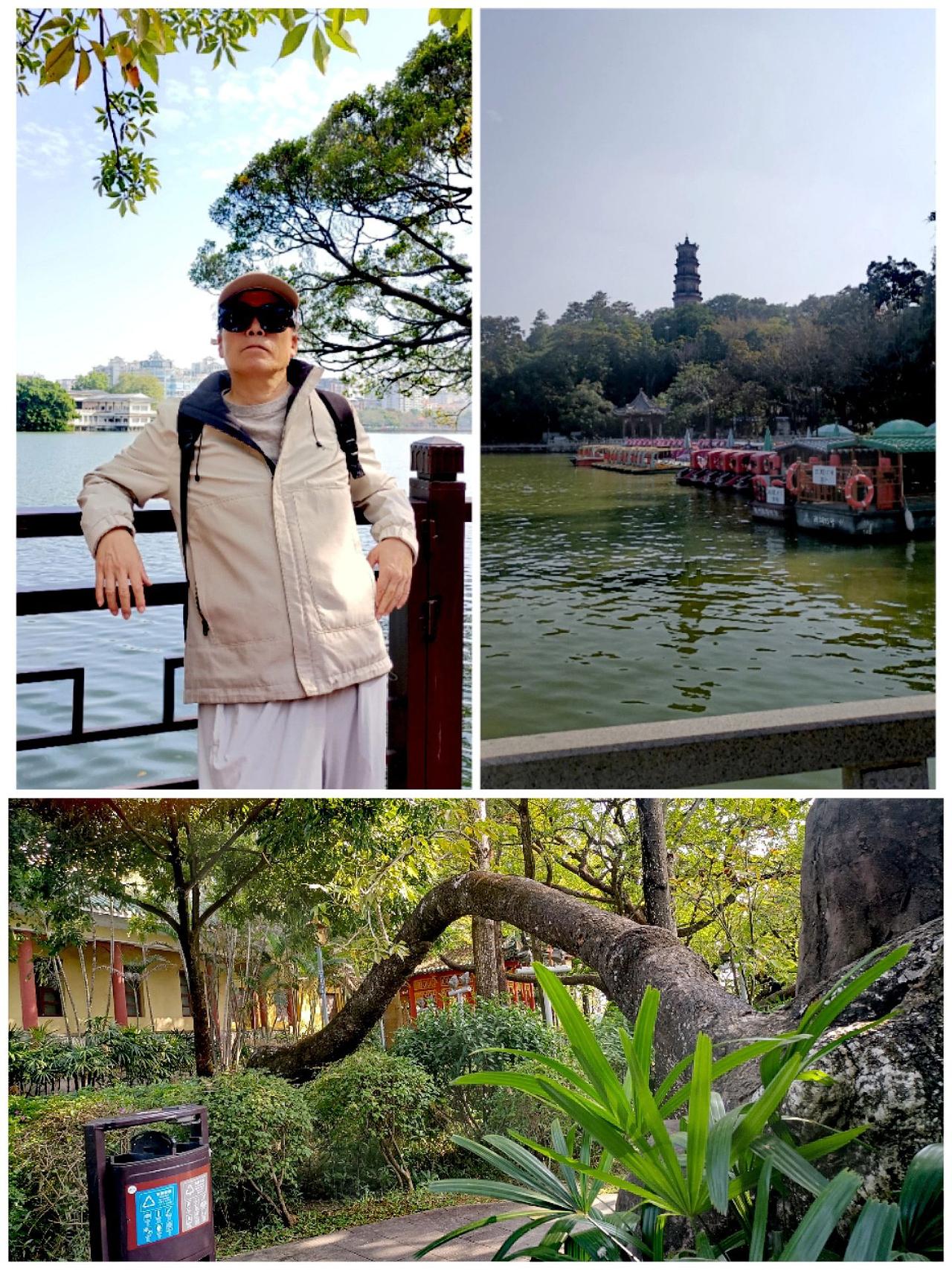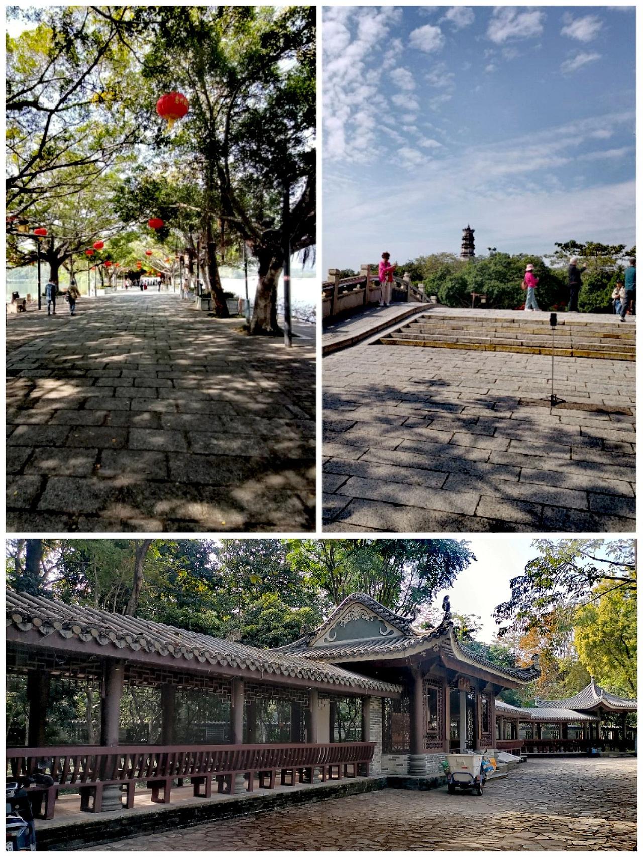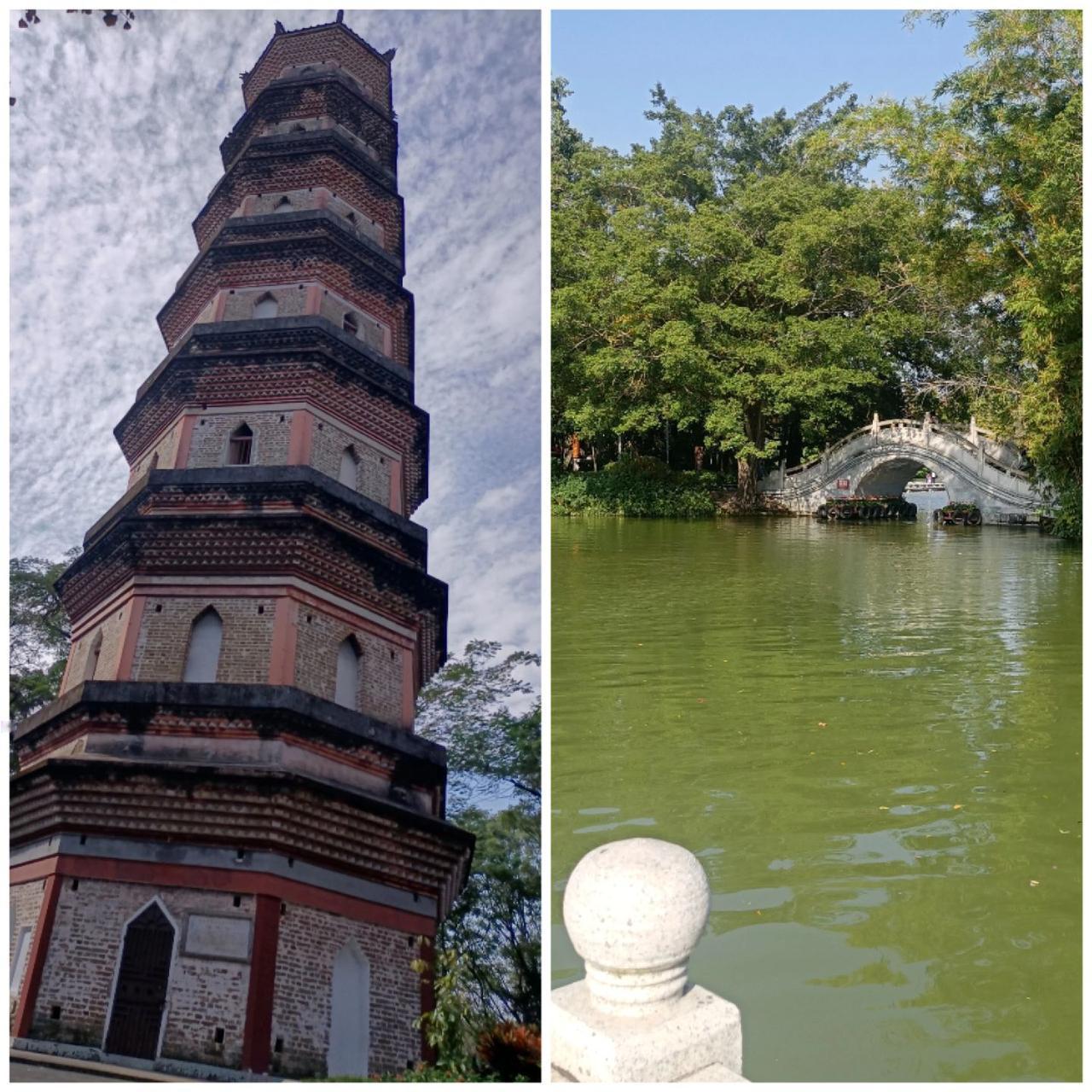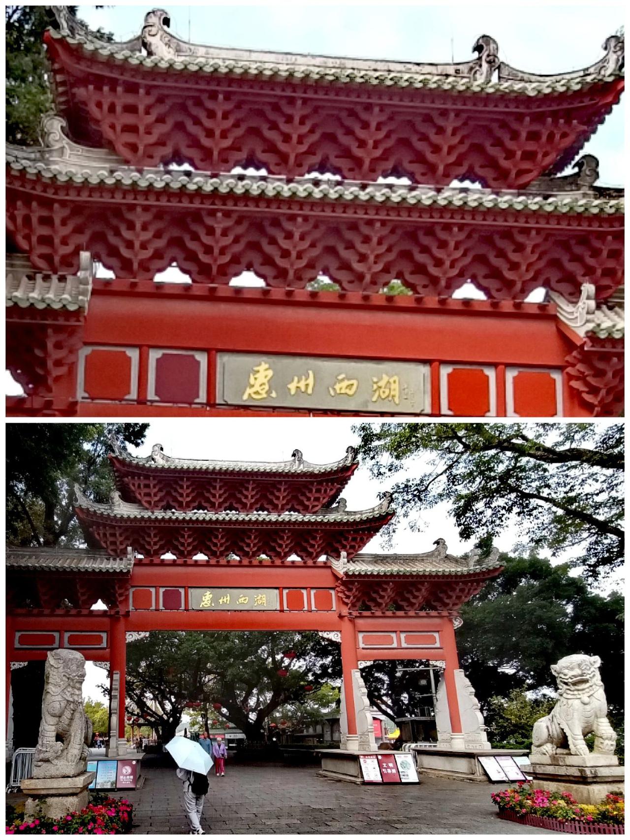 从杭州西湖来到了惠州西湖(图1-2)。不经意以为是同一个西湖。看!这里是惠州西湖的苏堤景区(图3),也有类似杭州苏堤的桥(图4右),只是泗洲塔与众不同(图3上右.图4左.图5上右),图5下的那棵树很有情调。 走过惠州西湖苏堤,透过古色圆门(图6),风景秀丽,水榭亭台;走进去廊亭高耸,九曲奇景(图7-8),最妙的是惠州西湖也有孤山,山上有苏东坡纪念馆,慢慢踱过去,芳华洲湖景也很好看(图9)。 惠州 西湖 名胜古迹 风景