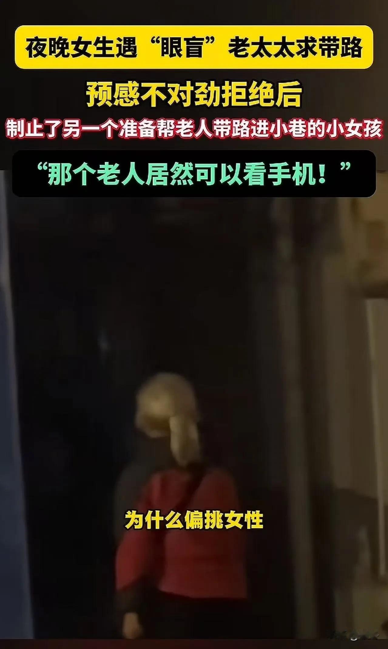 午夜惊魂:老太太的诡异请求 那晚十点多,小李(化名)独自走在回家路上。冷清的街道上突然冒出一个拄着拐杖的老太太,颤巍巍地拦住她:"姑娘,我眼睛看不见,能带我走一段吗?"就在小李犹豫时,老太太补了句:"就在前面那个黑巷子里......" "等等!"小李后脖颈的汗毛都竖起来了。第一,老太太怎么确认她是女性?第二,正常人谁会要求陌生人带路去漆黑的小巷?她借口不认路快步离开,却多了个心眼——假装走远后悄悄折返。 接下来看到的画面让她血液凝固:那位"盲人"老太太正熟练地刷着手机!更惊悚的是,老人很快又拦住另一个独行女孩,同样的说辞,同样的黑巷子方向... 细思极恐的破绽清单 视觉悖论:真盲人不会说"姑娘你看",更不会精准锁定独行女性 科技穿帮:我国盲人用手机确实有语音辅助,但绝不会像常人一样盯着屏幕滑动 地点陷阱:正常人求助首选派出所、便利店,而非监控死角的暗巷 目标筛选:据观察,老人专挑160cm以下的瘦小女性,对男性视而不见 "我当时腿都在抖。"小李回忆道,"但还是冲上去拦住了那个准备带路的女孩。你们猜老太太怎么说?'我们两个女的怕什么'——这话听着就更不对劲了!" 网友炸锅:该不该保留善意? 事件曝光后评论区直接裂开: "我外婆是真盲人,晚上根本不敢独自出门,这演技太拙劣!"——点赞8.2万 "现在骗子都学会沉浸式体验了?建议直接竞逐奥斯卡"——神回复被顶到热门 但也有反对声:"别污名化残疾人!我见过盲人用手机购物"——引发激烈辩论 四、防坑指南:善良的正确打开方式 黄金三问: "需要帮您报警吗?"(真求助者会接受) "附近派出所/保安亭在哪?"(观察对方反应) "我用手机照明可以吗?"(拒绝则必有猫腻) 安全替代方案: 替叫网约车(平台有记录) 联系其家人(当面视频确认) 引导至摄像头可视区 危险信号清单: ✅ 拒绝公开场所协助 ✅ 指定密闭空间 ✅ 回避穿制服者 ✅ 同行者突然"偶遇" 记得那个被救下的女孩后来私信小李:"谢谢你没让我成为社会新闻主角..."在这个复杂的世界,最大的善良或许是——既不做冷漠的看客,也不当待宰的羔羊。毕竟,真正的求助者从不会责怪你的谨慎,而骗子最恨的就是清醒的头脑。路上的老人 路遇老太 路边的老奶奶