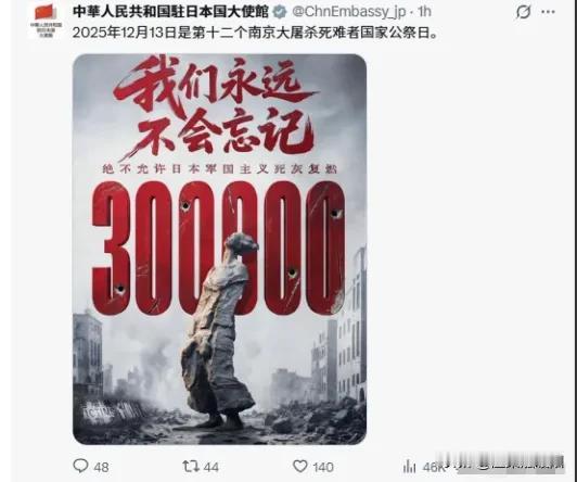 这次我们一个日本字都没写!中国驻日大使馆今天(12月13日)发文写道:2025年12月13日是第十二个南京大屠杀死难者国家公祭日,并附图,图中,巨大的红色 “300000” 字样让人醒目,一位衣衫褴褛、身形佝偻的受难者形象立在下面,当时的绝望和苦难是我们现代人无法想象的。 1937年12月13日,侵华日军攻破南京城,这座六朝古都瞬间沦为人间炼狱。华中方面军司令官松井石根、第六师团师团长谷寿夫亲自下令,日军开始了长达六个星期的疯狂屠杀,手无寸铁的平民、放下武器的士兵,都成了他们刀下亡魂。15日汉中门外,2000余名军警被机枪扫射后焚尸灭迹;16日中山码头,5000余名军民被射杀抛江,仅数人侥幸存活;18日草鞋峡,5.7万余名难民被铅丝捆绑,扫射、刀戳后浇油焚烧,残余骸骨尽数投入长江。东京《日日新闻》甚至公然报道日军士兵向井、野田的“百人斩比赛”,两人砍杀平民后狂笑攀比,如此反人类的暴行,被他们当成“战功”炫耀。 30万遇难者的数字从不是空穴来风,而是铁证如山的历史事实。远东国际军事法庭判决书明确,日军占领南京最初六周,仅未抛江焚尸的遇害者就达20万以上,加上日军少佐太田寿男供认的15万具抛江焚尸数量,总数远超30万。南京审判战犯军事法庭更精准认定,集体屠杀遇难者19万余人,慈善机关收埋的零星遇害者尸体达15万具,两份权威判决,将日军罪行永远钉在历史耻辱柱上。2015年《南京大屠杀档案》入选联合国教科文组织世界记忆名录,意味着这段历史成为全人类共同记忆,不容任何篡改。 日本右翼势力却从未停止歪曲历史的卑劣行径。他们将“南京大屠杀”篡改為“南京事件”,甲级战犯松井石根的秘书田中正明,公然篡改日记删除暴行记录,谎称屠杀是“虚构”。原第六师团参谋长下野一霍为战犯谷寿夫叫屈,宣称其“蒙冤致死”,日本熊本县甚至为侵略日军举行慰灵祭,公然为军国主义招魂。前防卫大臣稻田朋美更公开否认“百人斩比赛”,为施暴者辩解,多次参拜供奉甲级战犯的靖国神社,企图洗白侵略罪责。这些言行,是对30万冤魂的亵渎,更是对人类良知的践踏。 并非所有日本人都选择遗忘,不少有良知的人始终在守护历史真相。原侵华日军士兵东史郎,战后公开自己的战时日记,揭露日军暴行,生前7次到南京谢罪,用余生弥补过错。小学教师松冈环20多年来60多次赴南京取证,采访百余名日军老兵和受害者,出版书籍还原真实历史,即便遭到右翼围剿也从未退缩。历史学家家永三郎为让教科书保留大屠杀史实,与日本政府打了32年官司,最终迫使法院认定删除史实违法,他们用坚守,点燃了真相的火种。 设立国家公祭日,从不是为了延续仇恨,而是为了铭记苦难、警示未来。88年前的中国积贫积弱,才让侵略者有机可乘,30万同胞的鲜血告诉我们,落后就要挨打,和平从来不是妥协换来的。今天的南京早已从废墟中崛起,中国也不再是当年任人欺凌的国家,我们以国之名祭奠亡魂,是要告慰逝者,这盛世如他们所愿;更是要警醒世人,法西斯暴行不能重演,军国主义幽灵必须警惕。 历史记忆不会因时间流逝而褪色,30万遇难者的名字或许大多已被遗忘,但他们的苦难的每一个中国人心中刻下烙印。日本右翼越是试图篡改历史,我们越要坚定守护真相,让后代永远记得,那段山河破碎的岁月,记得无数同胞用生命换来的和平。 强大的国家,是逝者最好的告慰,是和平最坚实的后盾。我们铭记历史,是为了不让悲剧重演;我们奋力前行,是为了守护来之不易的安宁。每一次公祭,都是一次精神的淬炼,更是一次力量的凝聚,这份记忆,将永远激励中国人砥砺奋进,守护家国、捍卫和平。 感谢你的阅览与点赞,欢迎在评论区讨论。