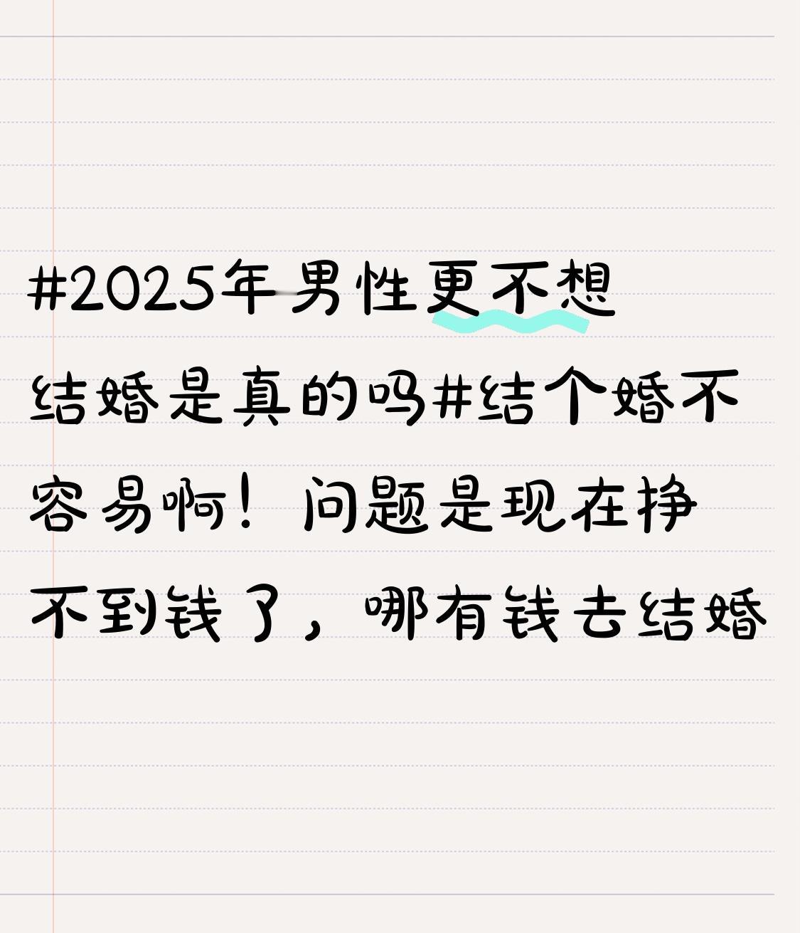 2025年男性更不想结婚大概率是真的。现在结婚成本太高,让很多男性望而却步。截止2025年,我国单身人口约2.9亿,男性比女性多3400万。结婚得有房有车有彩礼,2024年一线城市房价收入比达26.1,二线城市为10.8,河南、江西等地彩礼二三十万很常见,婚礼花销也得10 - 30万。婚后养孩子成本也高,0岁至本科毕业平均约68万。再加上离婚率高,离婚还得分财产,网上各种骗婚案例又多,男性对待婚姻自然越来越谨慎,不想结婚也在情理之中。 不是不想接,而是没有钱结婚