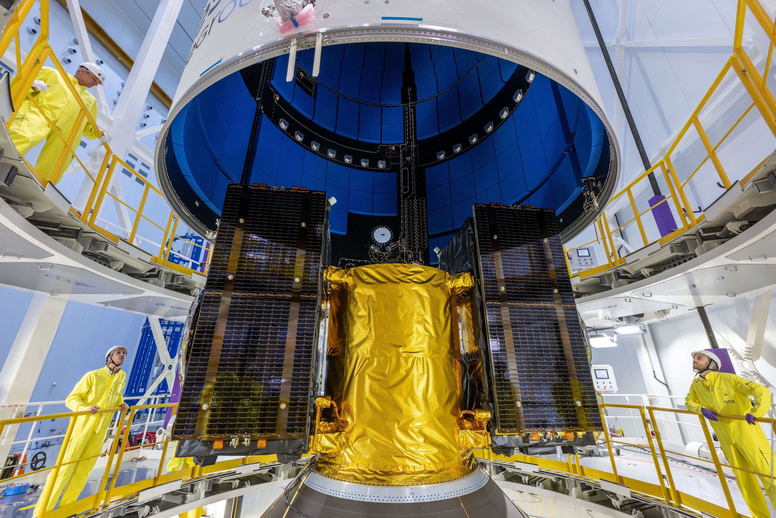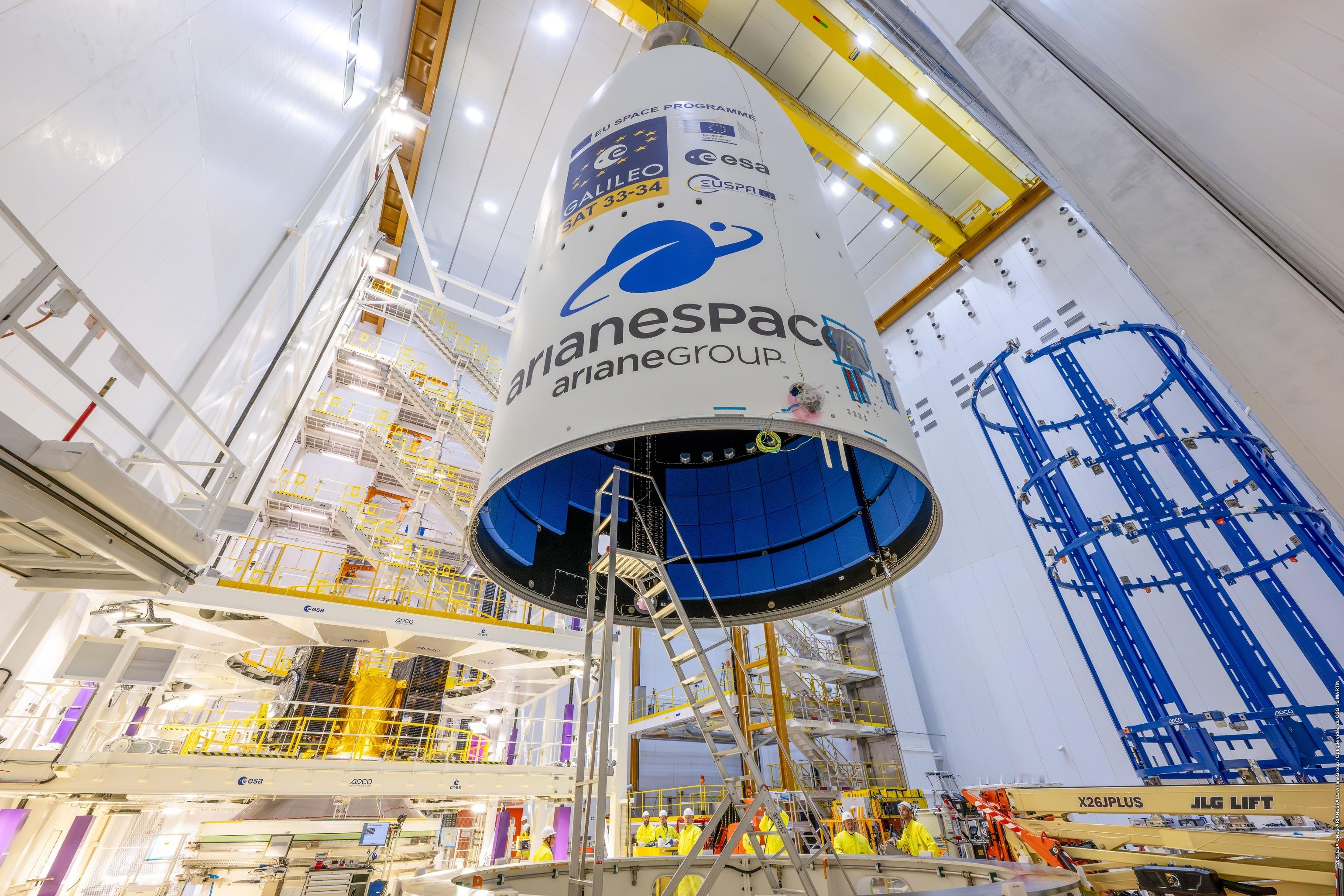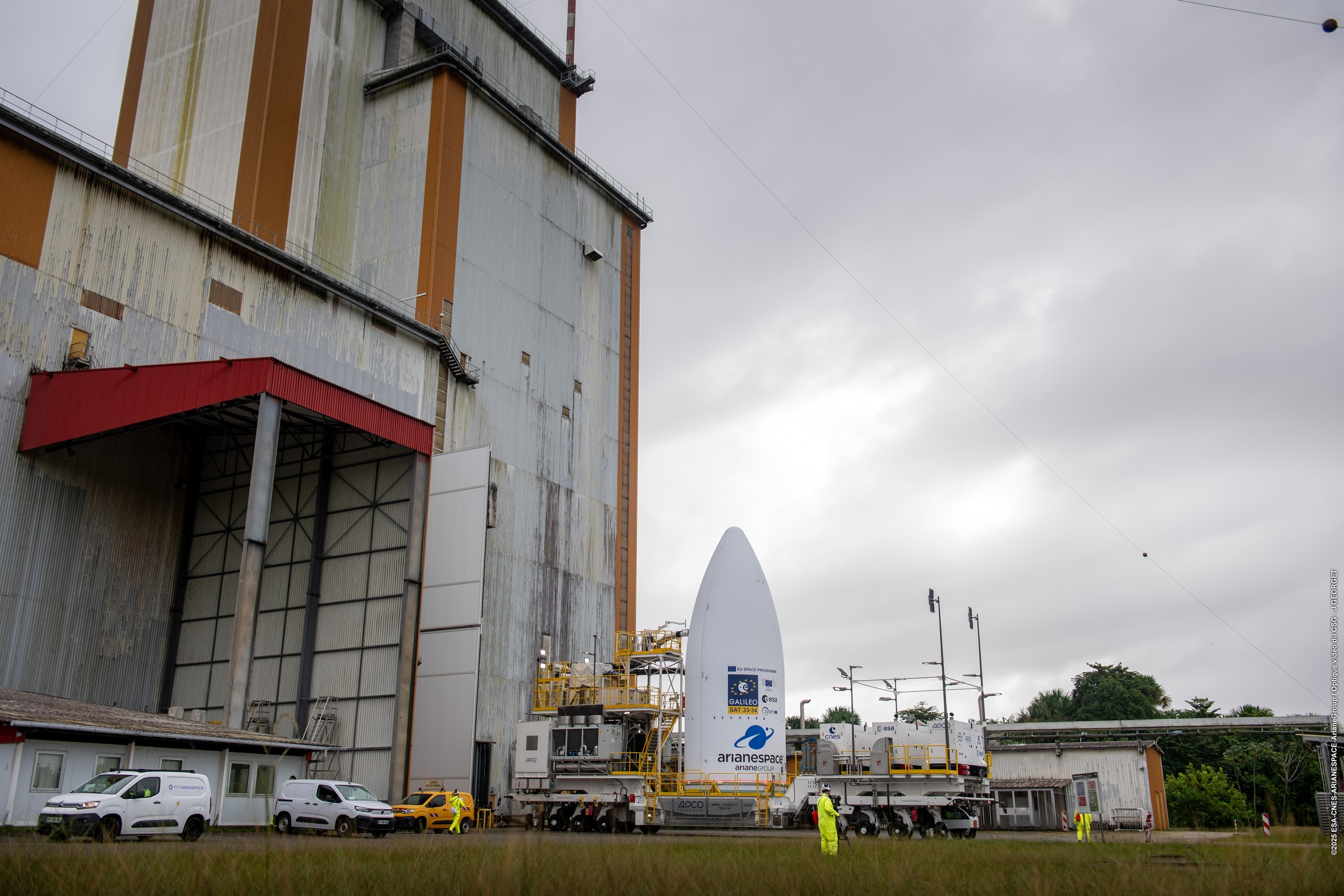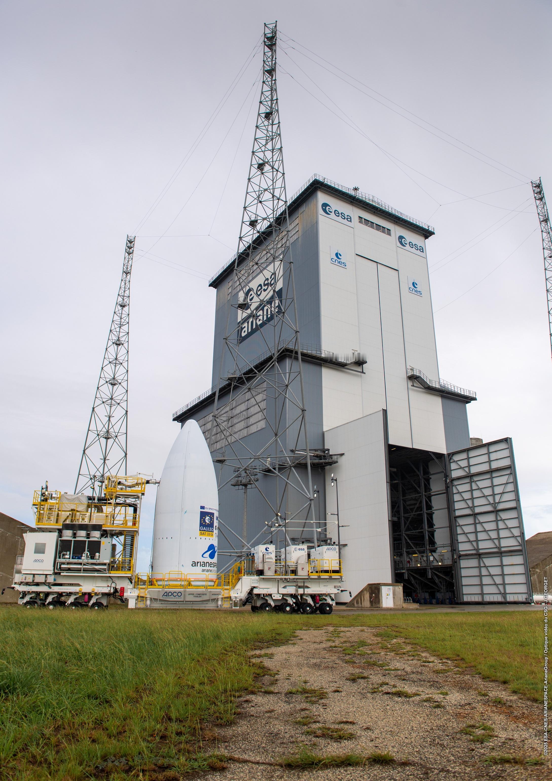 【阿丽亚娜6运载火箭VA266任务瞄准12月17日发射】欧洲阿丽亚娜航天公司(Arianespace)计划于2025年12月17日13:01使用阿丽亚娜6(Ariane 6)运载火箭,从法属圭亚那库鲁航天中心(Europe's Spaceport in Kourou, French Guiana)执行VA266飞行任务,将两颗伽利略(Galileo)导航卫星送入中地球轨道(Medium Earth Orbit, MEO)。这将是阿丽亚娜空间在2025年的第七次发射,也是伽利略计划第14次业务发射(Galileo L14)。任务从起飞到卫星分离的预定持续时间为3小时55分钟。两颗卫星将被部署至高度约22922公里、轨道倾角54°的中地球轨道,载荷总重约1.6吨。本次发射的伽利略卫星33号(SAT 33)和34号(SAT 34)由德国OHB系统公司(OHB System AG)研制,单星发射质量约700公斤,设计寿命12年,提供全球导航覆盖。此次发射将使伽利略系统进一步提升系统精度、可用性与稳健性。伽利略系统目前为全球45亿用户提供服务,在铁路、海事、农业及搜救等关键领域发挥重要作用。根据欧盟单一市场规定,该区域销售的所有智能手机必须兼容伽利略信号。作为主承包商,阿丽亚娜集团(ArianeGroup)牵头的欧洲工业团队为本次任务提供火箭。整流罩(短型)高度14米,直径5.4米。上面级高9米,配备Vinci闭式膨胀循环液氢液氧发动机,推力180千牛。芯一级高32米,配备Vulcain 2.1开式循环液氢液氧发动机,推力1370千牛。P120C固体火箭助推器高22米,直径3.4米。整箭起飞重量500吨,起飞推力8000千牛。该火箭系统具备模块化与多任务适应能力,由阿丽亚娜集团协调600余家欧洲企业共同完成,其中约350家为中小企业。飞行时序:-7秒:Vulcain 2.1主发动机点火0秒:起飞+2分14秒:固体助推器(Equipped Solid Rockets, ESR)分离+3分30秒:整流罩分离+7分45秒:芯一级分离+7分53秒:二级首次点火+3小时38分:二级第二次点火,将卫星送入22923公里中地球轨道+3小时55分:两颗伽利略卫星依次分离+3小时57分:二级钝化,任务结束