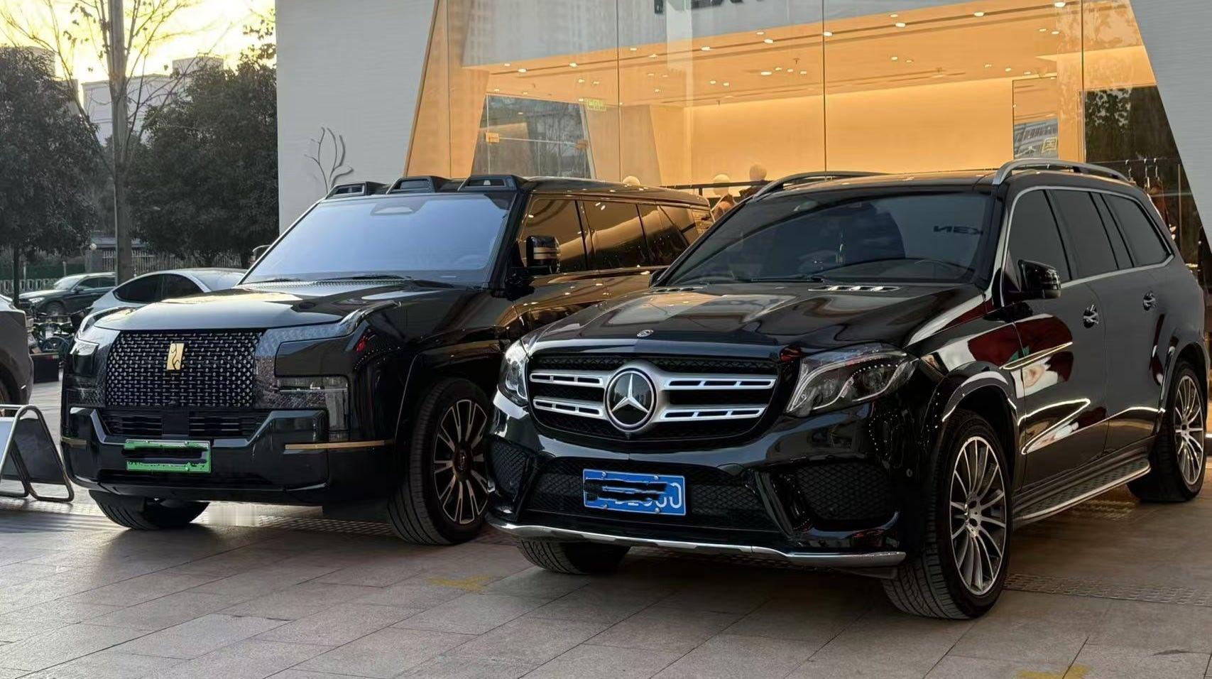 女朋友见到了仰望U8L,拍给我看。挺巧的,和奔驰GLS停在一起了,U8L明显更霸气