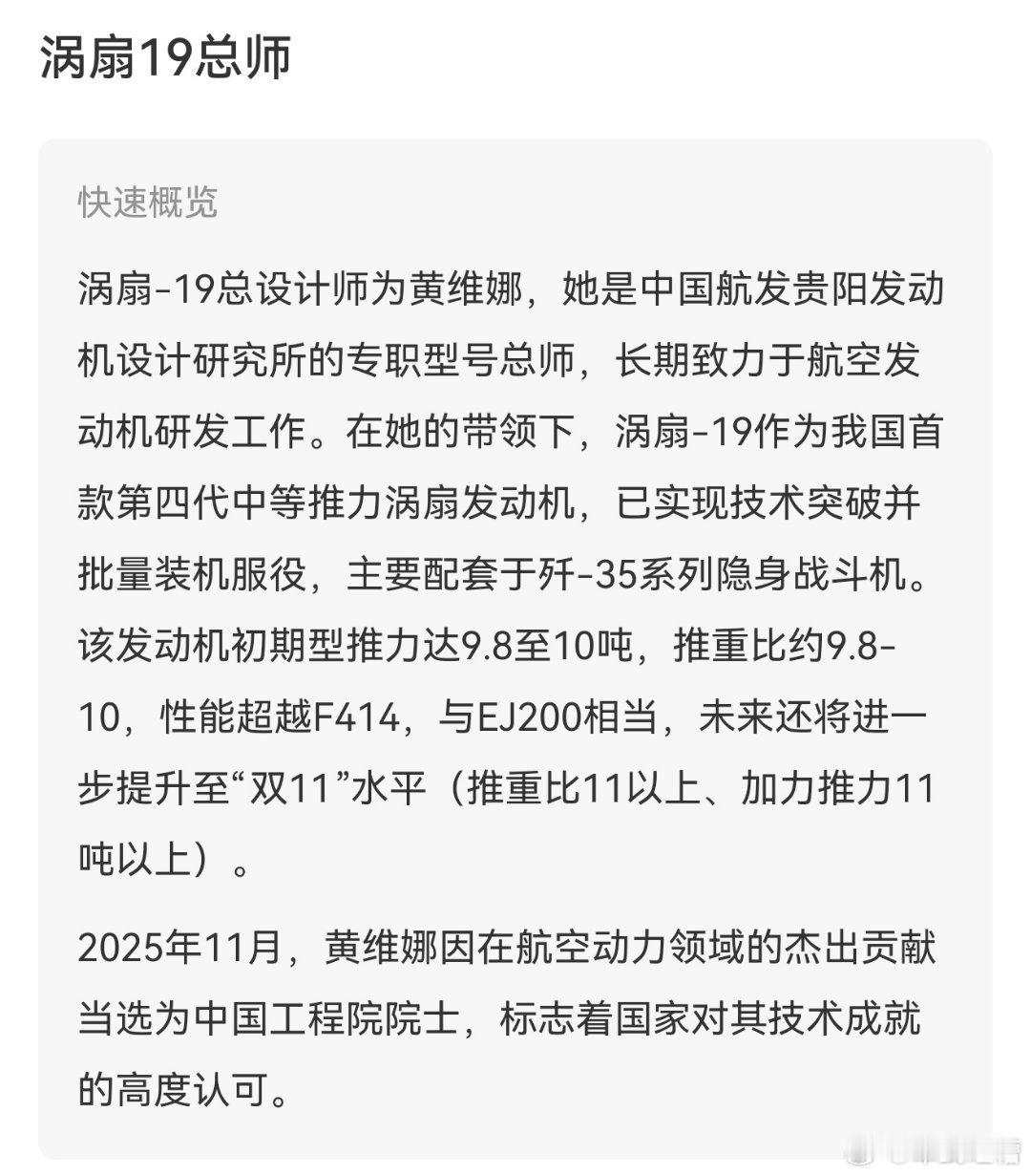 这才是真正的巾帼不让须眉涡扇19总师黄维娜当选为中国工程院院士如果没记错的话,这也是国产高性能航发的第一名女总师涡扇19作为第四代中等推力发动机,搭配歼35使用,一举让中国迈入了双五代机时代,功绩完全不输歼20烽火问鼎计划热点解读