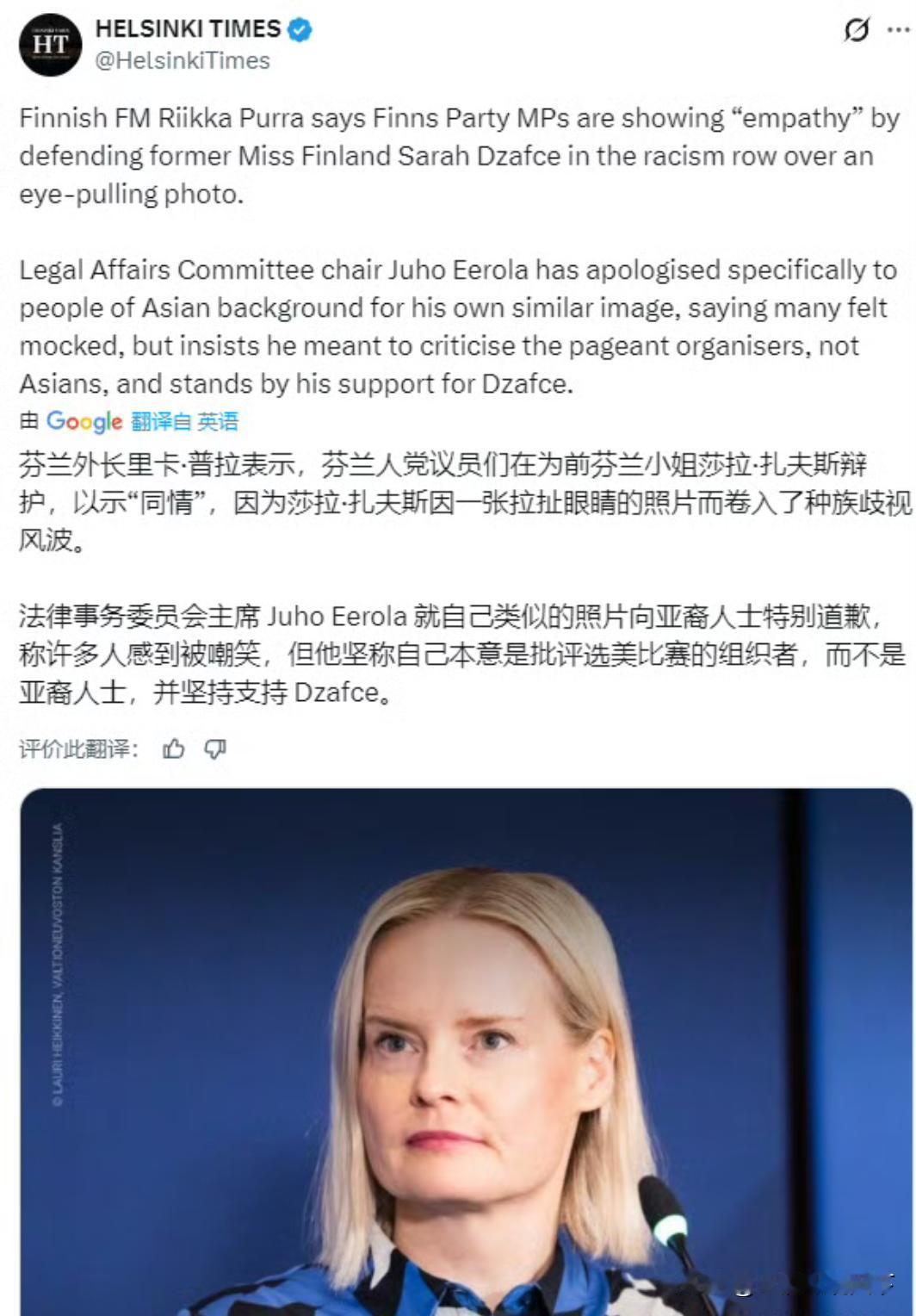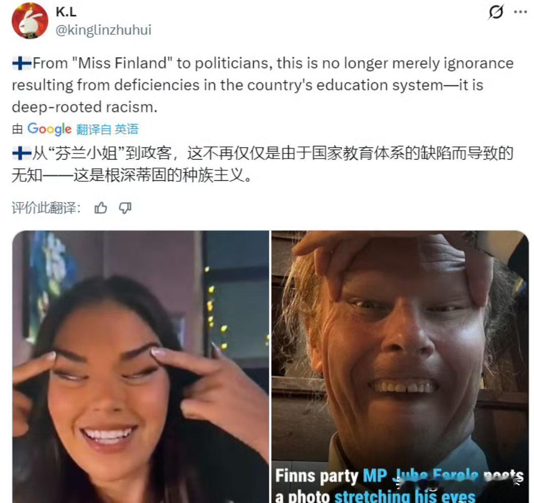 太无耻了!屁大的芬兰竟如此猖狂,种族歧视一名国人!这名芬兰小姐”莎拉·扎夫切因一张照片引发热议!她发文声称,“跟一名中国人吃饭”,照片中她还用手指拉扯眼角做出“眯眯眼”的动作!她知道这个动作的意思,但依然做了,非常猖狂。 事情舆论闹大后,她出来解释称,这个动作不是歧视亚洲人!还在狡辩说是因为头痛按摩太阳穴,这个借口是多么愚蠢!最终舆论闹得太大了,她不得不出来道歉,想平息这场风波。 更让人愤怒的是,有些芬兰议员非但没有谴责她,反而公开模仿该手势以示支持她,声称“这没什么大不了的事情”,他们骨子里瞧不起亚洲人,总以为他们高高在上。
