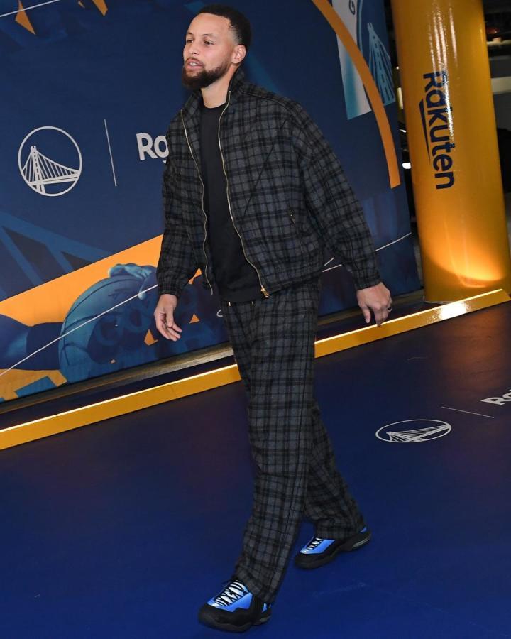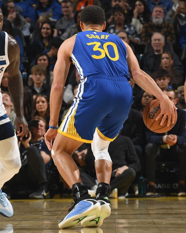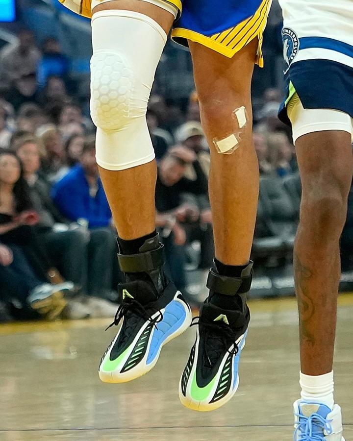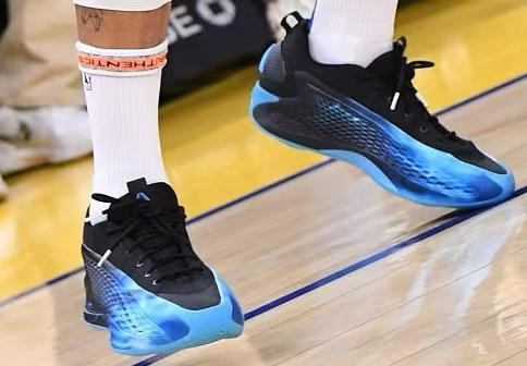 库里今天比赛时上脚adidas AE2 "Blue Fusion"爱德华兹2代,所以库里进球时,华子傻乐。赛前热身时上脚CLOT联名款adidas AE1 Low,进场时穿Nike Air Garnet3,致敬狼王加内特。库里