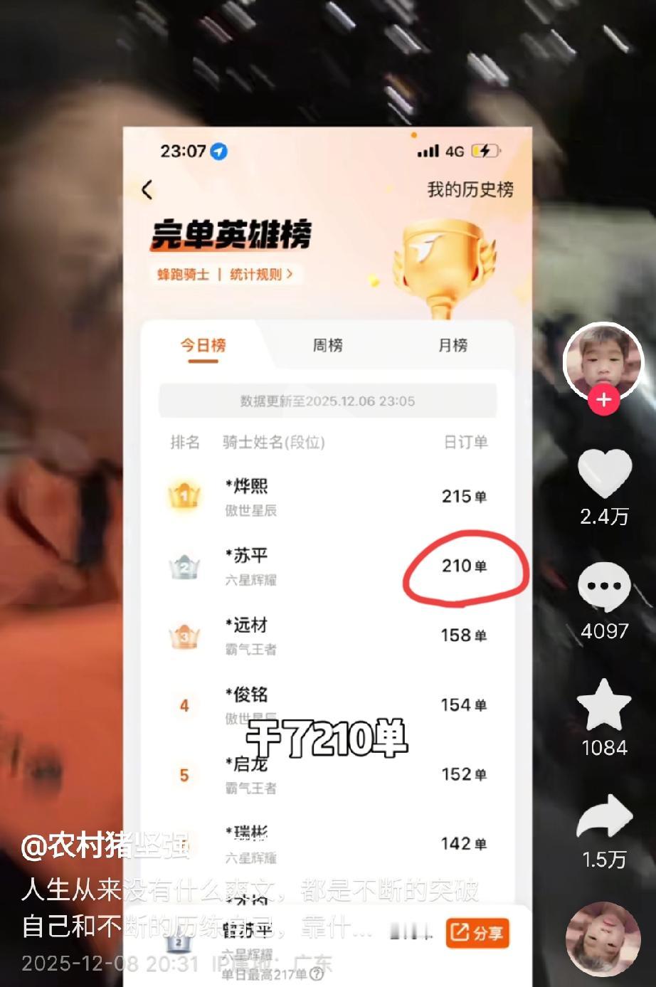 现在跑外卖这么卷的吗?刷到一哥们,从凌晨12点跑到当天晚上11点,整整23个小时。 他共跑了210单,但他还不是第一,第一跑了215单。 看到这个单量和时间,说真的,真担心他们的身体。 每天在大街小巷穿梭,精神都要高度集中,不然就很容易发生意外,跑这么长的时间,能休息好吗? 想挣钱没错,但没必要拿自己的健康和命来拼吧,你们觉得呢?
