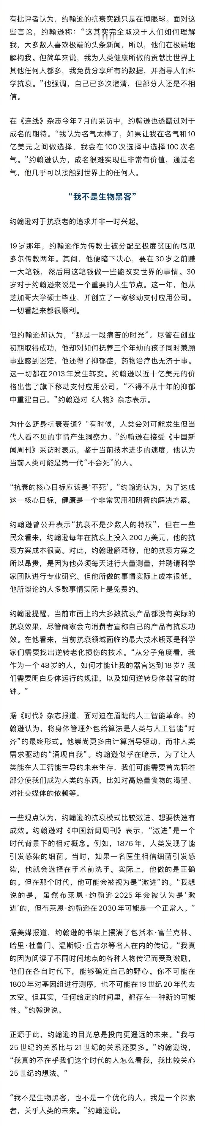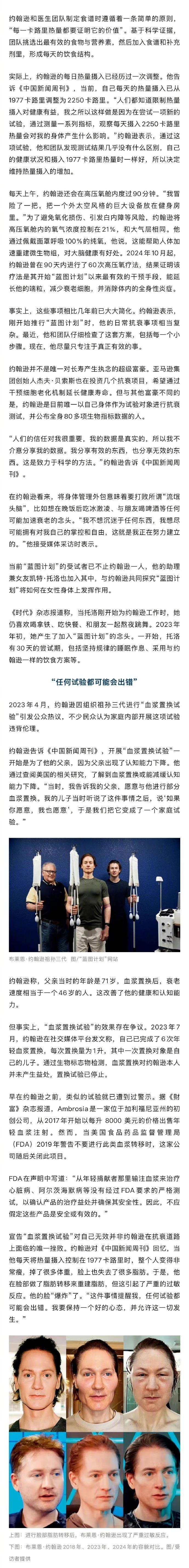 【拒绝变老!与儿子换血富豪每年抗衰花200万美元】换血富豪称血浆置换对自己抗衰无效 美国硅谷亿万富豪布莱恩·约翰逊为“抗衰老”,每年斥资200万美元实施“蓝图计划”,并曾进行包括与17岁儿子交换血浆在内的家庭试验。他宣称数据驱动,但试验本身存在伦理争议,且最终承认血浆置换对他本人未产生可测量的益处。全网热点共创计划这点智商却拥有这么多的财富,真是“财不配位”。一些“老不 死的”希望通过输入年轻人的血液而让自己年轻起来,这不仅仅是“好傻好天真”,更是“既蠢又坏”。因为这是绝对没有任何作用的。年耗200万美元追求永生,实为“财不配位”的极致体现。将儿子的血浆视为“青春燃料”,这不单是科学认知的荒谬,更是伦理底线的失守。富豪痴迷于用金钱对抗自然法则,其本质是特权阶层对生命规律的僭越。当财富被用于资助此类近乎“人体炼金术”的实验,而非普惠大众的医学研究时,这种“抗衰老”就已从私人执念,异化为一种对社会价值的扭曲示范。