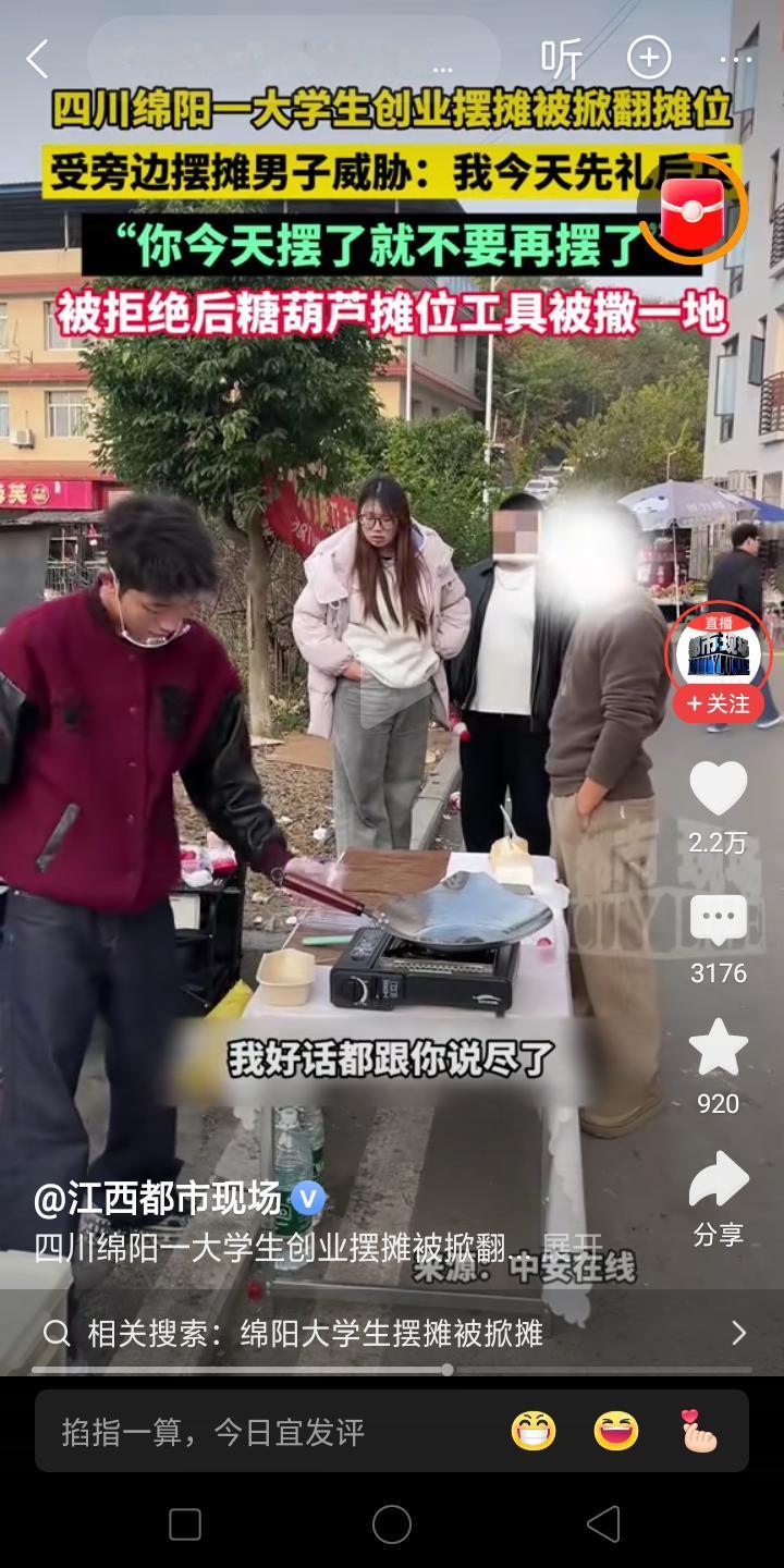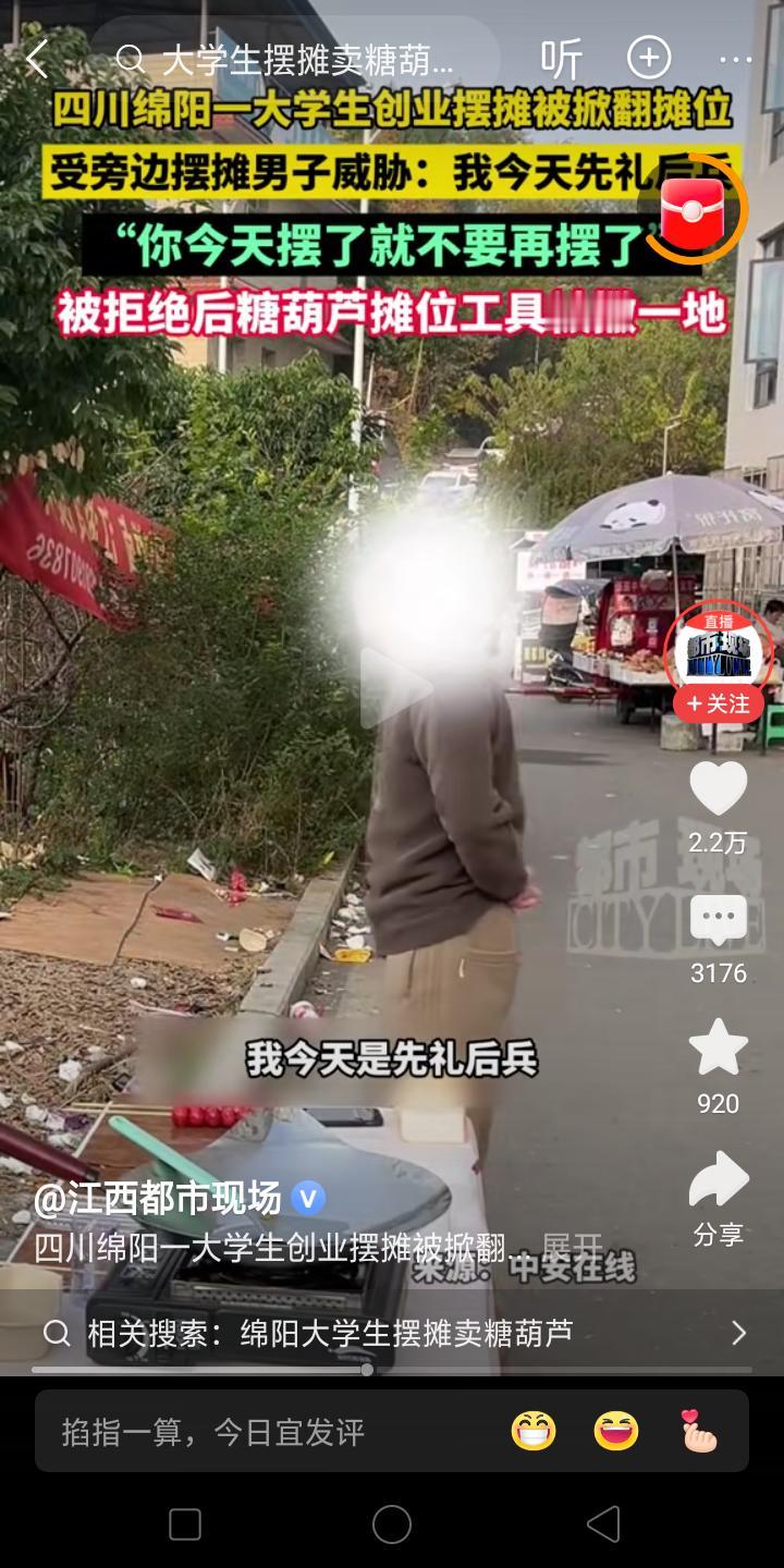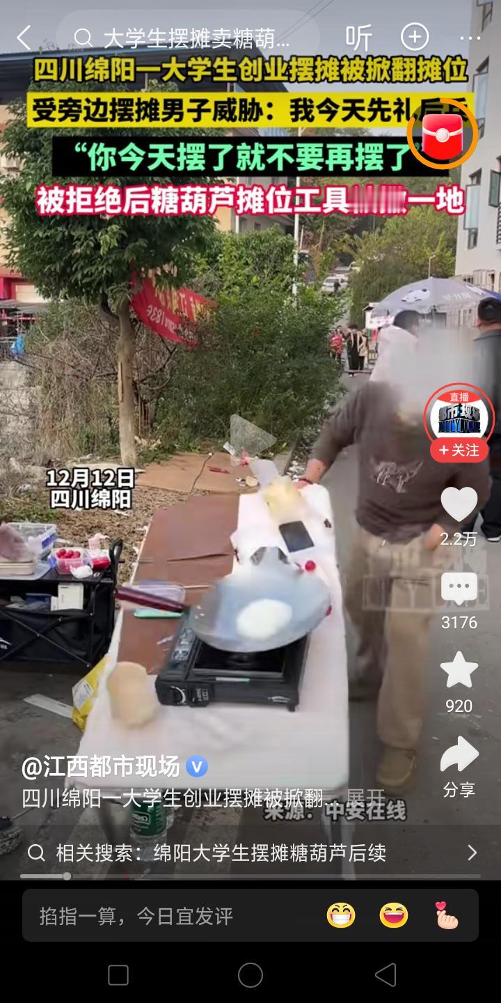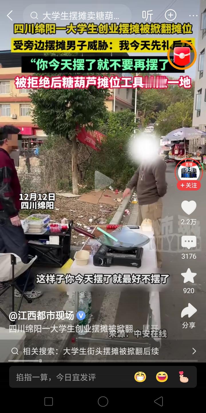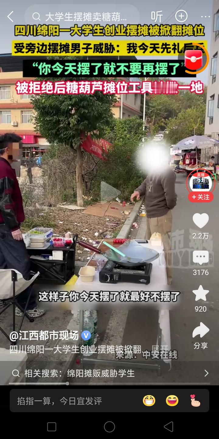 流氓啊! 大学生创业摆摊卖冰糖葫芦,被老摊贩刁难,让他明天不要再来了!可是年轻人可不听他的,说我明天还要来,气的老摊主给他把摊子推倒在地,两个人扭打在一起!!! 我记得我们镇上一个卖水果的人,他们一家都在镇上卖,只要有外人来,他们就把别人赶走!!故意停在别人卖东西的前面挑衅!有的人惹不起就落荒而逃了! 这就是地头蛇吧,虽然摆摊上有一个老规矩,就是谁摆久了地方就是谁的,大家都很自觉遵守的,但是有一些新人他不懂啊,认为这地方你又没有买下,我凭啥不能摆,你能摆呢? 但是现在是法治社会,大家还是好好说话吧!