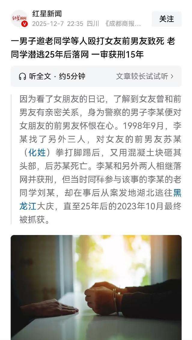 湖北宜昌,男子偷看女朋友日记,发现她曾和前男友发生过关系,男子怀恨在心邀请三个同学一起殴打前男友致其死 亡。案发后男子和两名同伙分别获刑,但最后一人却人间蒸发了。近日,最后一名犯罪嫌疑人终于被捕并受到处罚。 据红星新闻报道,一本已经发黄的日记,本来只是记录个人情绪和过往经历的私人物件,却在无意中改变了几个人的人生轨迹。 1998年发生的那起命案,直到二十五年后仍被重新提起,不只是因为案件本身残酷,也因为它在司法认定上反复引发争议:口头上的“教训人”,究竟是在什么时候,演变成了对生命的直接剥夺。 事情的起因说起来并不复,李某性格偏执,占有欲很强,一次女友外出工作时,他擅自翻看了对方的日记。 那些原本只属于私人空间的文字,被他逐字读完,日记中提到,女友在认识他之前,曾与苏某有过一段关系,不只是普通交往,还涉及较深的亲密内容。 这些记录让李某情绪彻底失控,羞愤、嫉妒和不甘混在一起,很快转化成对苏某的强烈敌意。 他并没有选择冷静处理,也没有与女友沟通,更没有尝试自我克制,而是私下联系了刘某等三名熟人。 几个人多次碰头,反复商量,最终决定找机会拦住苏某,“给他点教训”,在他们看来,这只是一次出气行为,却没有意识到事情早已朝着不可控的方向发展。 1998年9月17日,李某利用工作便利,从单位借来一辆车,并将车停在苏某日常通行的路段附近,苏某骑着摩托车经过时,被示意停车,并未意识到危险已经临近。 很快,几个人围了上来,随即动手,苏某在短时间内被打倒在地,几乎失去反抗能力,此时如果停手,后果或许还不至于失控,但暴力并没有结束。 几个人在路边捡起混凝土块继续攻击,这些建筑废料又硬又重,每一次砸向头部,都可能造成致命伤害,殴打过程中,头部成为主要攻击部位,还夹杂着其他器具的击打。 事后法医鉴定显示,苏某头部遭受多次钝器重击,颅骨出现粉碎性骨折,脑组织严重损伤,并伴有大量出血。 这些客观结果,与“只是打一顿”的说法明显不符,更为严重的是,在苏某已经基本失去意识、无法自行行动之后,几个人并没有报警,也没有采取任何救助措施。 而是将他拖到公路旁的坎下,扔进荒草中,随后驾车离开现场,这一行为,实际上完全切断了他获救的可能,苏某最终因严重脑损伤和失血过多死亡。 案发后不久,李某和另外两名参与人员被警方抓获,作为策划者,又是借用公车实施犯罪,李某的行为性质极其恶劣,最终被以故意伤害致人死亡罪判处无期徒刑,剥夺政治权利终身。 但案件并未就此结束,当时参与动手的刘某成功逃离,长期下落不明,这一逃,就是二十多年,在这段时间里,刘某辗转多地生活,刻意回避原有社会关系。 随着时间推移,侦查条件和技术手段不断升级,2023年10月,黑龙江大庆警方在日常排查中,通过信息比对锁定刘某身份,将已经步入中年的他抓获归案。 案件重新进入司法程序后,围绕罪名认定出现了明显分歧,检方起初根据现有证据和刘某的供述,拟以故意伤害罪追究其刑事责任,并提出十五年有期徒刑的量刑建议。 这一结果很快引起苏某家属的强烈不满,在家属看来,这并非一次失手的斗殴,用混凝土块反复砸击头部,本身就具有高度致命性。 而在受害者濒死状态下将其抛弃,更说明行为人对死亡后果并非毫无预见,案发现场遗留的大量血迹,也成为他们无法忘却的证据。 法院在审理过程中,对全案证据进行了系统梳理,虽然刘某始终强调自己只是听从李某安排,并未主观上想要杀人,但法律判断并不只依据口头表态,而更看重行为方式和客观结果。 使用足以致命的工具攻击要害部位,并在明知可能造成死亡的情况下放任结果发生,已经构成对生命的严重侵害。 同时,法院认定刘某并非从犯,他在事前参与商议,在现场直接动手,属于共同犯罪中的主要参与者。 案件审理期间,刘某家属筹集25万元赔偿款交给受害者家属,并取得了一份谅解书,这在司法实践中通常会作为量刑参考因素。 但法院认为,赔偿无法抵消行为本身的严重性,尤其是刘某到案后供述前后不一,试图减轻自身责任,难以认定其具备真诚悔罪态度。 最终,法院依法变更罪名,认定刘某构成故意杀人罪,综合其在案件中的作用、赔偿情况等因素,判处其有期徒刑十五年。 这起跨越二十多年的案件,最终在法律上得出明确结论,它提醒人们,所谓“出气”或“教训”,一旦越过底线,