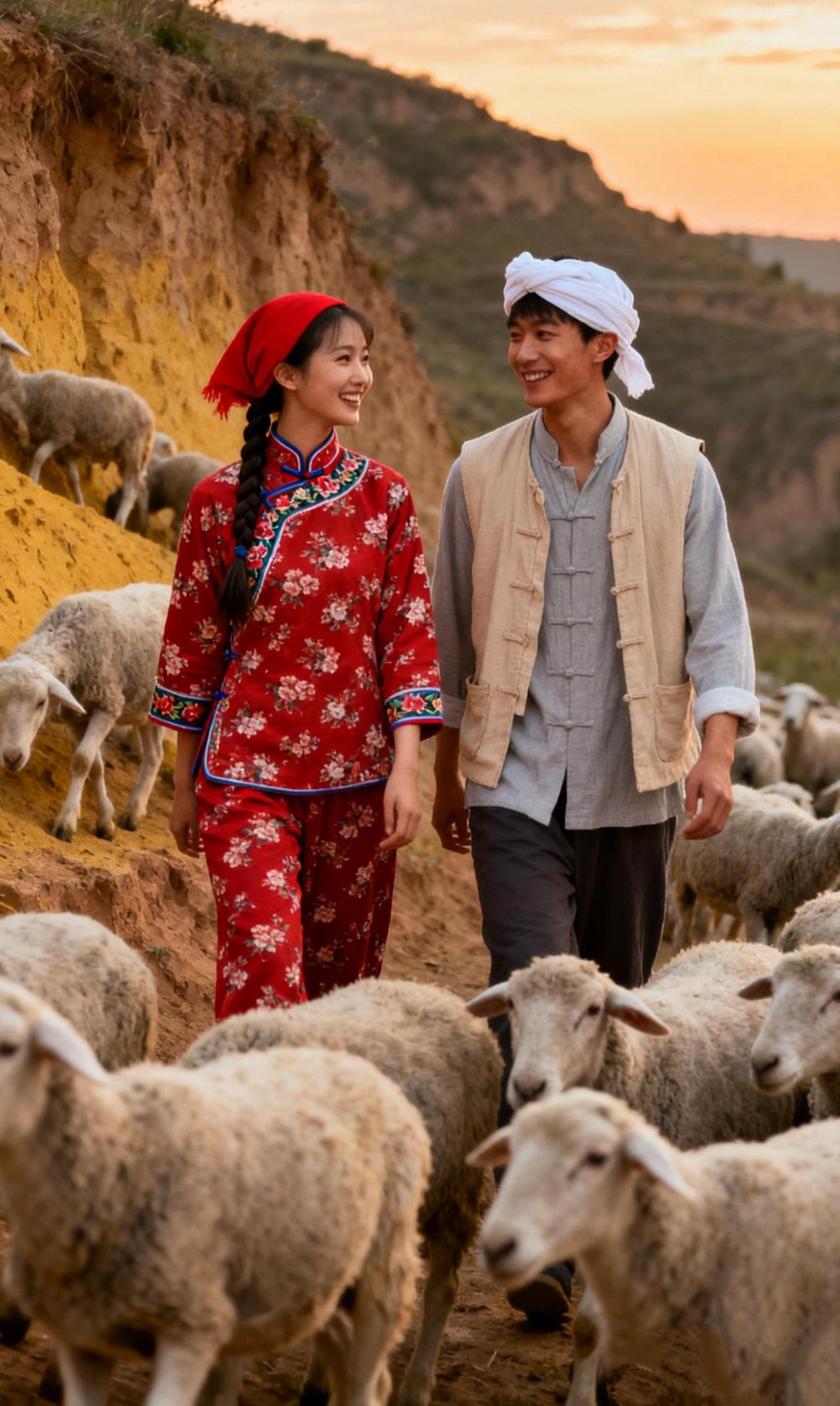 《塬上晚风》 黄土坡头落日融, 羊群漫走影重重。 红衫映得霞千缕, 白巾摇出风一篷。 笑语随云飘塬上, 情如汾水绕山冲。 赏析:这首诗以陕北黄土塬的牧羊场景为核心,勾勒出质朴又鲜活的乡土情致。首句“落日融”铺陈出黄昏时分暖融融的氛围,“羊群漫走”则勾勒出画面中羊群簇拥的动态感;接着以“红衫”“白巾”对应人物的装扮,用“映霞”“摇风”的动态描写,让人物形象在黄土背景中格外鲜亮;最后两句聚焦人物的笑语与情感,将无形的情意比作汾水绕山,把陕北乡土里的真挚情愫具象化,全诗语言质朴明快,既贴合陕北的地域特色,又让画面里的温情与烟火气跃然纸上。 黄土风光 秋日黄土坡 黄土塬 塬下风景 塬上风景 塬畔人家 塬上落日