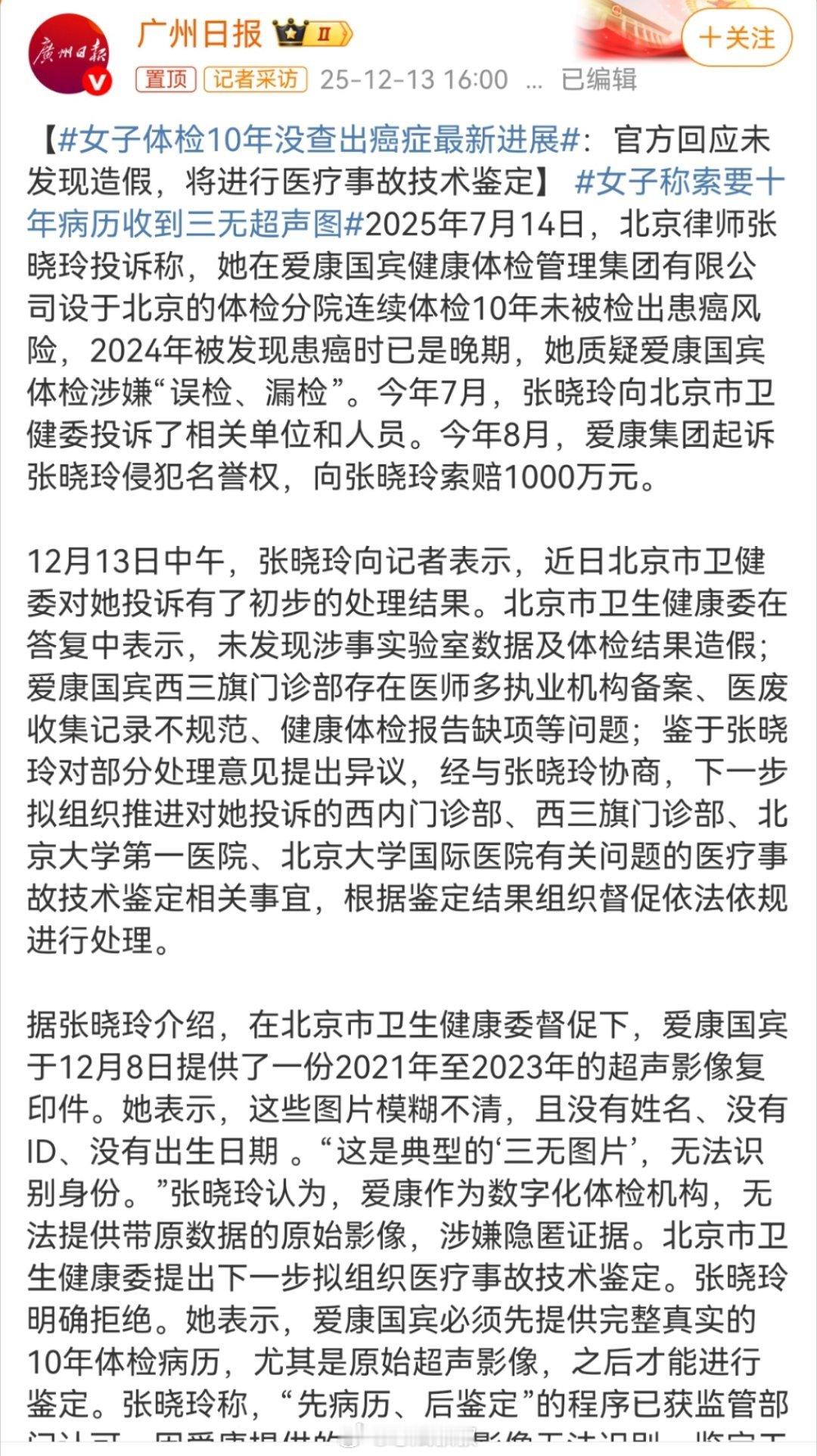 女子体检10年没查出癌症最新进展在北京市卫生健康委督促下,爱康国宾才在12月8日提供了一份2021年至2023年的超声影像复印件。但是这些图片模糊不清,且没有姓名、没有ID、没有出生日期 。这竟然是‘三无图片’,无法识别身份,也无法提供带原数据的原始影像。而且面对张晓玲方面“三无”病历的指控,截至发稿,爱康国宾也尚未作出公开回应。没想到这种大机构居然还有这样的情况。不过我也真的问过干科研的朋友。人家说体检还是去三甲大医院,因为仪器的精准度,以及具体临床判断经验都是非常重要的。 长春