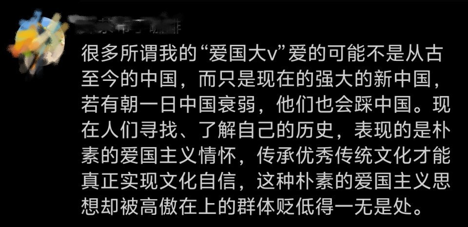 不要相信网上的所谓“爱国大V”。这个赛道良莠不齐,他们的爱国情怀甚至不如普通老百姓朴素无华。有一种人可以称为既得利益集团。屁股决定脑袋,当他们在网络上审判别人是否爱国以及扣帽子给别人的时候,本质还是想垄断爱国的解释权,维护既得利益。但国家真要有什么事,也许跑的比谁都快。真正到最后与国家共存亡的始终是底层老百姓。这就是国家兴亡匹夫有责的意义。