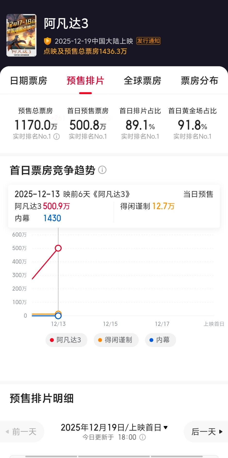 报,周末路人爆发的时候,得闲谨制今日票房倒挂7个点。与此同时,12月19日即将上映的阿凡达3已经开始预售,截止目前预售已经破1170万。