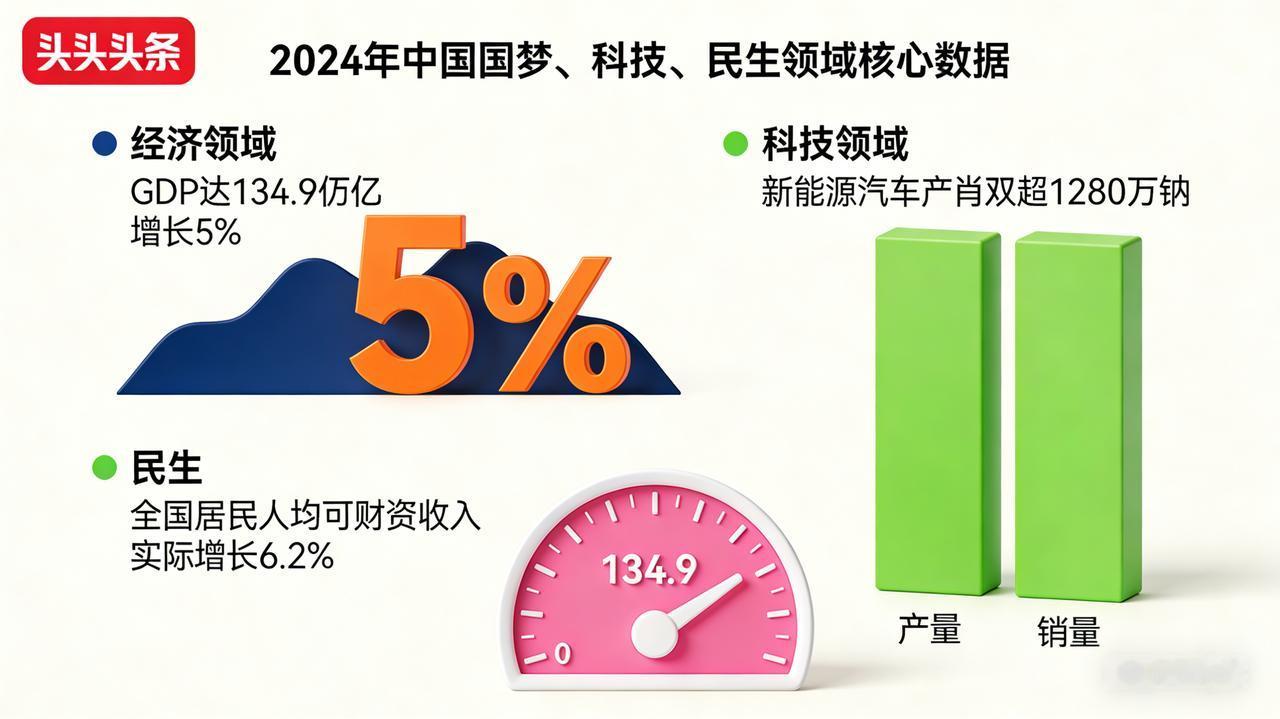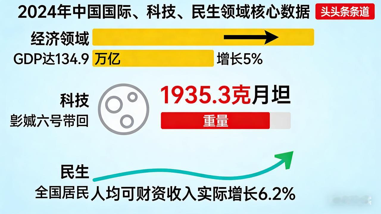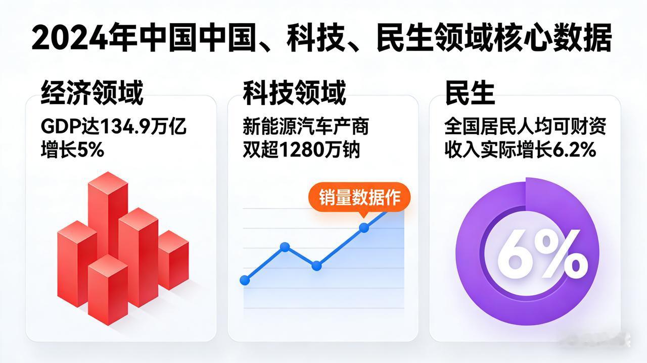 开局之年底气足!2024五大硬核事实,见证中国向上力量 2024作为关键开局之年,中国的发展底气从来不是空谈,而是由一组组硬核数据、一个个突破性成就实打实筑牢的。 经济大盘稳中有进是最足底气:全年GDP达134.9万亿元、增长5%,一季度就以296299亿元总量和5.3%增速打响头炮 。新能源汽车产销双超1280万辆,连续10年领跑全球,出口128.4万辆远销海外,成为外贸新引擎 。货物进出口总额突破43.8万亿元,对共建“一带一路”国家贸易占比首超50%,开放红利持续释放 。 科技突破让底气更硬:嫦娥六号完成人类首次月背采样,带回1935.3克月壤刷新认知 ;C919大飞机规模化运营,累计承运旅客超100万人次 ;FAST天眼发现脉冲星超1000颗,稳居世界射电望远镜首位 。 民生保障让底气更暖:全国居民人均可支配收入实际增长6.2%,农村居民增速达7.7% ;城镇调查失业率稳中有降,1.28亿台充电设施覆盖98%高速服务区,生活便利度持续提升 。 从经济韧性到科技锋芒,从开放格局到民生温度,2024开局之年的每一份成绩单,都在诉说中国发展的深厚底气。这份底气,藏在数据里、显在突破中、暖在民生里,更照亮了未来的前行之路。