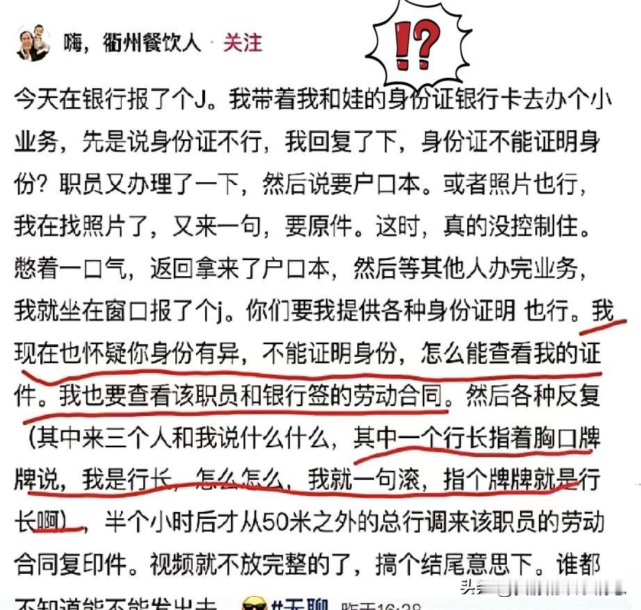 当你被“魔法伤害”的时候,最好的方法是使用“魔法打败魔法”! 浙江衮州的一个男子去银行办业务,结果被银行柜员要了好几样证件,他当时就纳闷了,这能办业务吗?要这么多证件,难道要把我从头到脚的证明一下身份吗?是不是证明不了自己的身份我就办不了业务了。 随后男子报警,称要调查这位柜员的身份。警方让银行核实柜员身份。银行方面行长都来了,柜员也在那儿,出示了好几种证件,还有劳动合同给他看,这才把他放走。 银行按规矩办事,防范诈骗是对的,但其实这么按规矩办事,让客户觉得自己像嫌犯一样,总觉得自己老实正派的人反而不能得到信任,感觉信任成本太高了。正常人也能被按得心态崩溃,银行有些时候真是死板的可怕。 制度就是个杠杆,撬动的是大事,小事都得自己想办法处理,结果现在都成了内耗。感觉给人带来的全是负面的,哪怕是按规矩办事,也会让人感觉不爽。这就是金融机构制度死板的后果,也是给社会带来的负面影响。