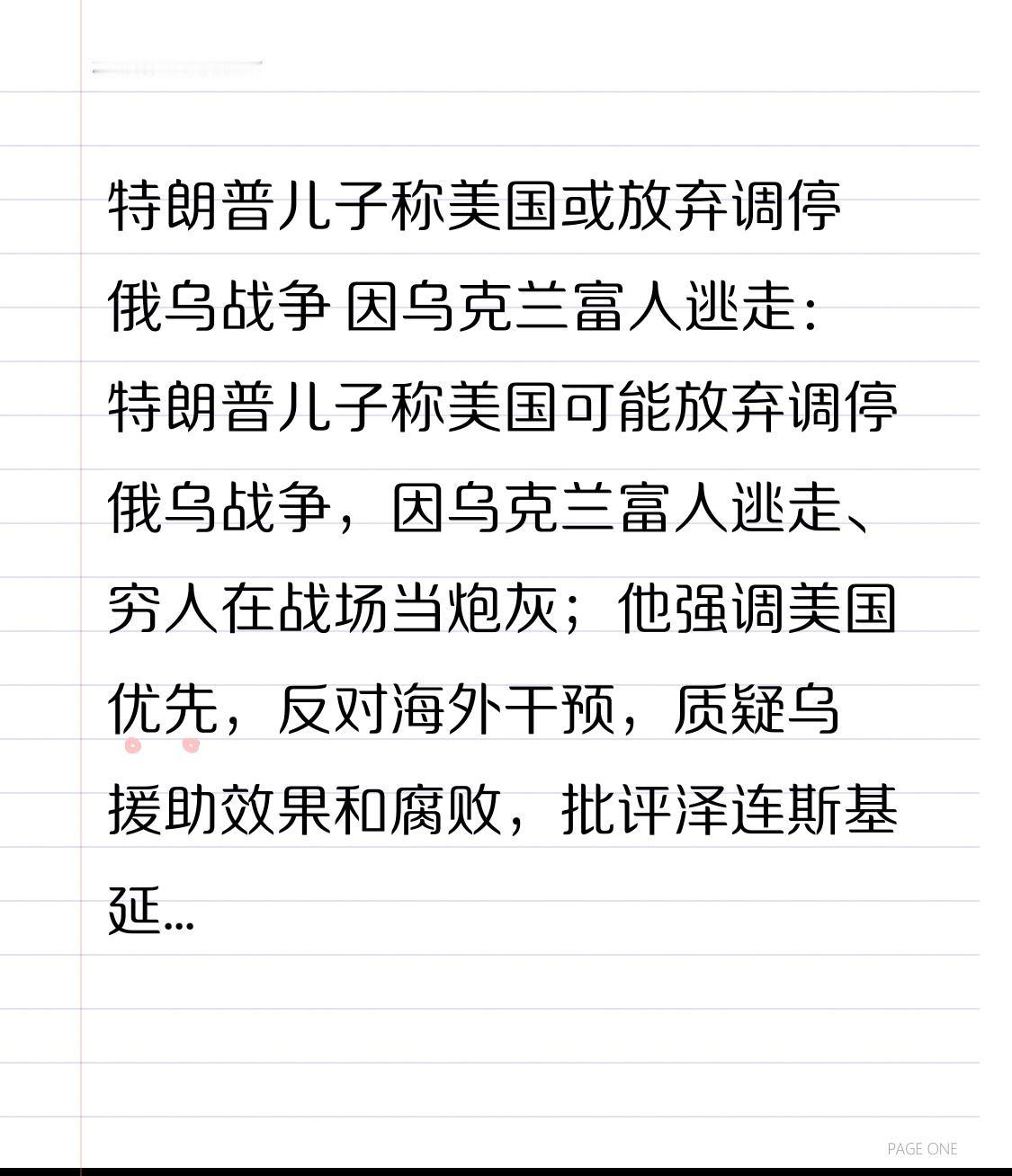 特朗普儿子称美国或放弃调停俄乌战争 因乌克兰富人逃走:特朗普儿子称美国可能放弃调停俄乌战争,因乌克兰富人逃走、穷人在战场当炮灰;他强调美国优先,反对海外干预,质疑乌援助效果和腐败,批评泽连斯基延战保权,用摩纳哥超跑例点出不公,认为美国别当冤大头。