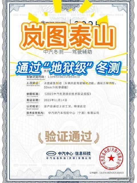 在选车时,除了外观、配置和续航,安全永远是绝不能妥协的底线。毕竟,车上坐的往往都是咱们最亲近的家人,有老有小,谁都不希望自己开着一辆“纸糊的车”上路,那心里得多不踏实啊,对不对? 近日,岚图泰山——这款新上市的大六座旗舰SUV,在天津中心搞了一场堪称“地狱级”的安全测试,那场面比那些动作大片里的特效还要刺激,让人看得是心惊肉跳,又忍不住拍手叫好。 这场安全测试名字听起来就让人心里直打鼓,什么螺旋翻滚后撞柱子、前后左右四面夹击,光是听这些挑战项目,就让人觉得够狠够绝。 结果岚图泰山竟然全都扛住了,还一举拿下了中汽中心颁发的TOP SAFETY顶级安全认证,并创造了多项行业首例安全测试纪录。 首先进行的是行业首次螺旋翻滚空中触碰挑战。车辆以50公里每小时的速度冲上单边桥,腾空翻滚后撞向刚性立柱,模拟了类似山路失控撞树或冲向杆柱的极端场景。 结果显示,其A、B、C、D柱均无明显变形,这得益于高强度钢铝混合车身与2200兆帕门环支撑;座舱结构保持完整,生存空间得到保障。 全车9个气囊(含侧气帘与远端气囊)瞬间点爆,并实现6秒超长保压,稳稳护住乘员。同时,车辆自动触发双闪、紧急呼叫等功能,车门也可正常开启,形成从风险识别到事后救援的全链路防护。 更为严苛的是行业首次四面夹击碰撞测试:岚图泰山先被后车以105公里每小时高速追尾,再撞击前方15.5吨卡车,随后遭遇左右两侧各一辆1.5吨轿车以65公里每小时同时夹击。 在这一模拟极端连环事故的测试中,乘员舱依然保持完整,关键在于其前后双堡垒式车门结构,使侧撞防护能力提升30%。车身通过多重防护网设计与七重正碰、五层追尾分级吸能系统,能够抵御高达110公里每小时的超美标追尾冲击。电池也在多次撞击后保持完好,未出现冒烟或起火。 岚图泰山通过此次极限挑战,不仅展现出在被动安全、电池防护及应急响应上的全方位实力,也为行业安全标准树立了新的标杆。在安全这件事上,它用近乎极致的测试,给出了一个值得信赖的答案。