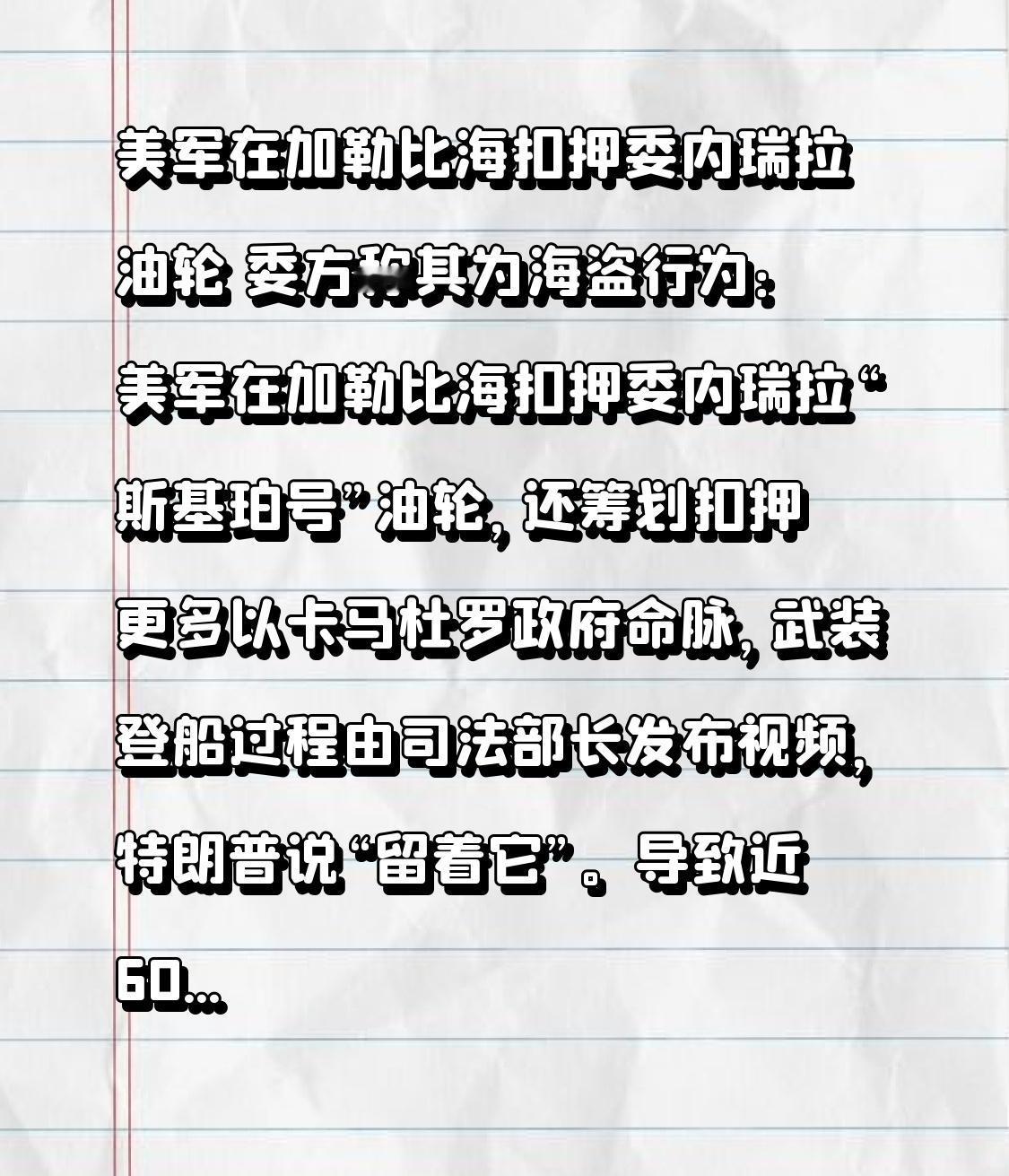 美军在加勒比海扣押委内瑞拉油轮 委方称其为海盗行为:美军在加勒比海扣押委内瑞拉“斯基珀号”油轮,还筹划扣押更多以卡马杜罗政府命脉,武装登船过程由司法部长发布视频,特朗普说“留着它”。导致近600万桶重油运输中止,航运商等评估风险。委内瑞拉称其为海盗行为,美国用“黑市石油”等老话术,违反国际航运惯例。