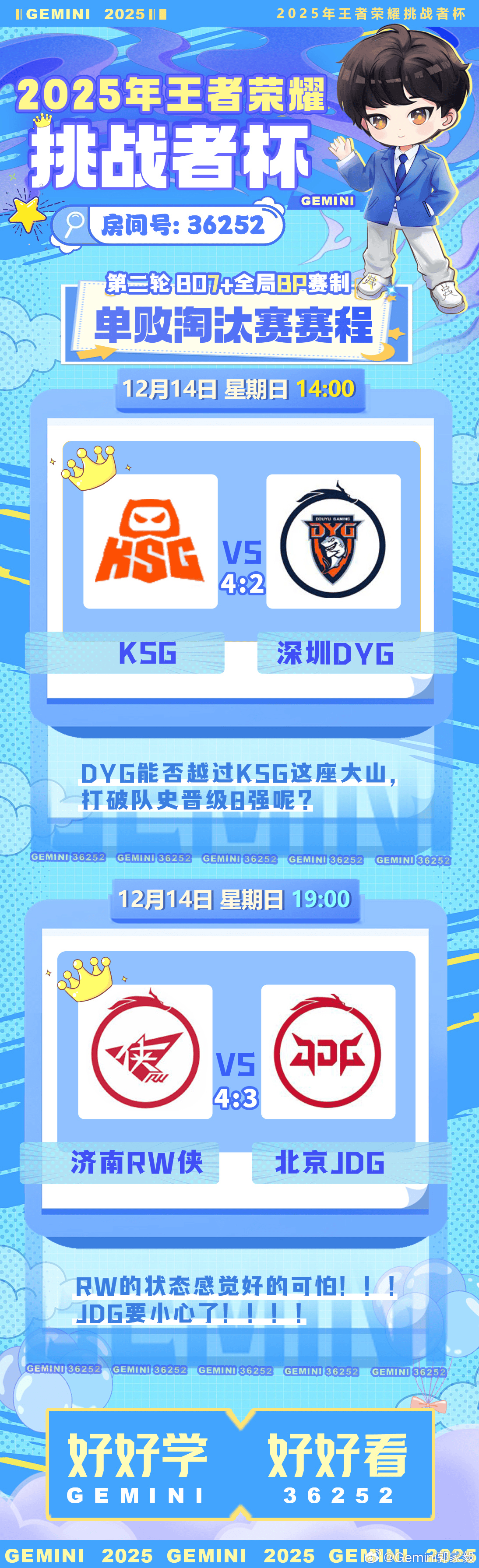 虎扑12月14日讯Gemini预测今日赛果:KSG4-2DYG,RW侠巅峰对决淘汰JDG