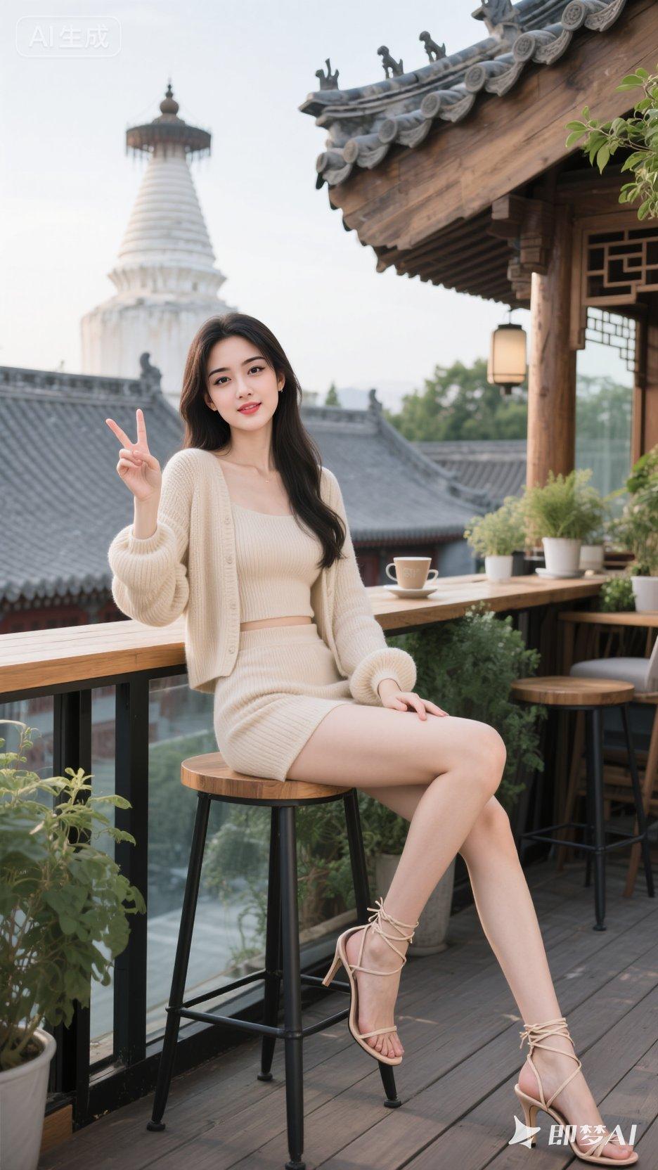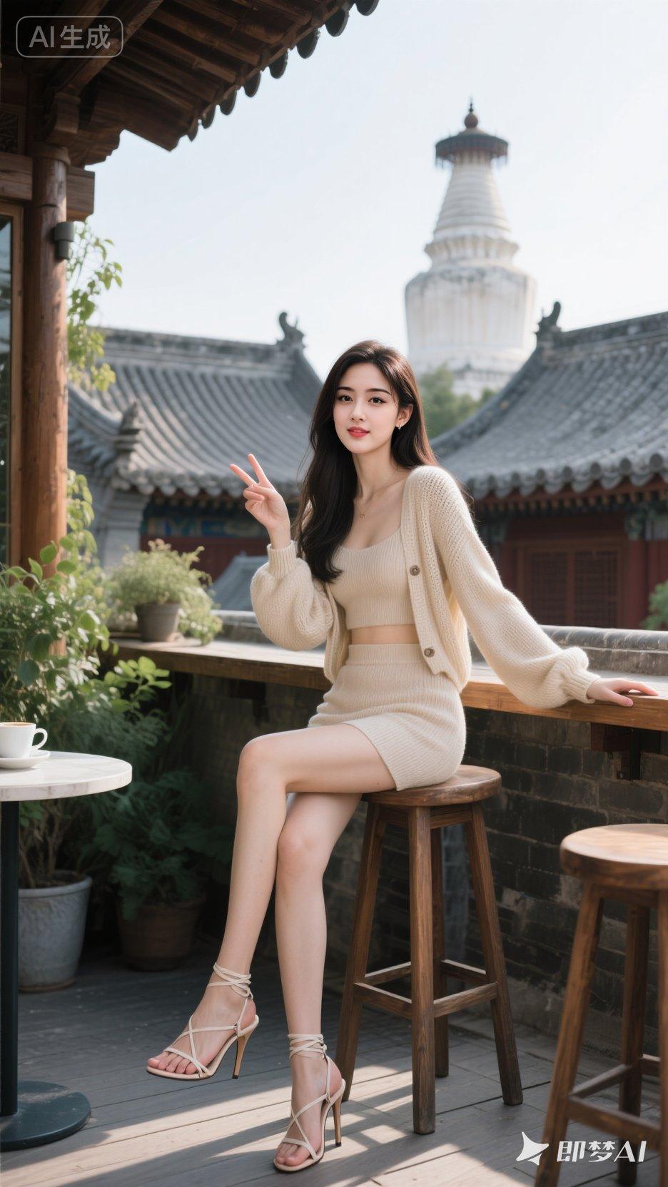 办公室女文员,25岁,穿着米白色贴身长袖衬衫,米白色包臀短裙,长发披肩,长相甜美