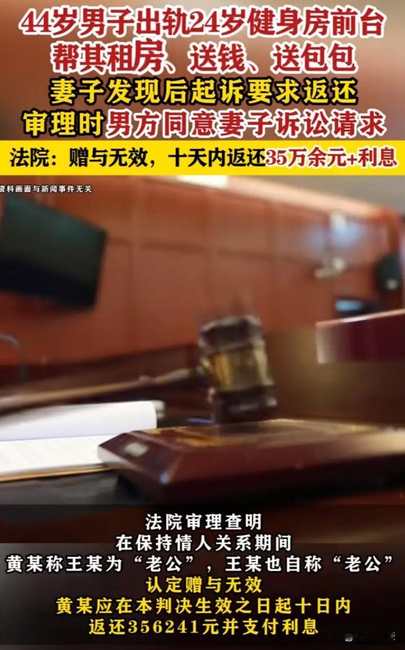 “白嫖?”上海,44岁已婚男子与24岁健身房前台发生不正当关系,短短16个月就给对方花了近47万元。男子妻子得知后,不愿意了欲将男子及其情人告上法庭,要求情人还钱。男子表示支持,不仅给妻子把为情人花的每一笔钱,列得清清楚楚,还偷偷录制了一段与情人沟通商议有关妻子已经发现其二人的不正当关系并将提起诉讼一事的录音。法院最终判决黄某限期返还魏某35.6万余元并支付相应的资金占用利息损失。 判决明显错误,什么叫共同财产的含义要依法搞清楚?共同财产应该就是男女双方各有一半吗?即然男子王某赠送给黄某的那依法不应返还,这个是王某的一半财产啊。 44岁男子王某与女子魏某已经结婚23年之久。王某11岁结婚,有点早。 无论最后判决结果如何,王某这枚渣男的铁帽子戴定了,无情有无义,实属古今罕见! 男人用的钱没有超过他们夫妻共同财产的一半,就应视作男人自己的财产,且是自愿赠与,不应返还。 既然是夫妻共同财产,那么有一半是属于男方的,而且男方是自愿赠予的,那么就不应该判决返还35.6万元。