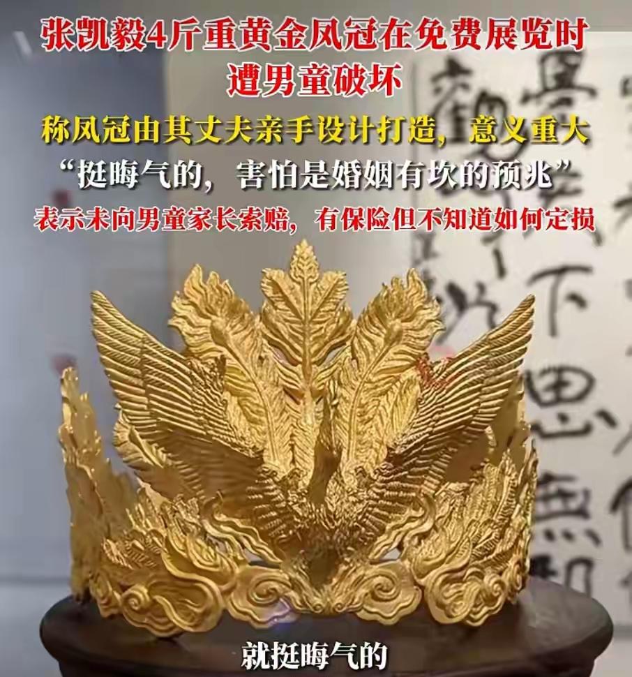 拥有千万粉丝的博主称自己的丈夫为自己打造4斤重的黄金凤冠,再一次免费的展览上被一名小孩破坏了,博主说先不谈钱的事,但是觉得这个事情很晦气,整个凤冠象征着象征着他们的爱情。这次展览是他们自己举办的,现场有请了保安维持秩序,凤冠也有基本的围罩,现场的一名男孩多次碰到凤冠就掉到地上了。网友们纷纷提出自己的建议,如果要追溯责任的话,那肯定是小孩的监护人,但是现场既然请保安了,保安也有责任,其实也有粉丝留意到,凤冠所在的柱子不够稳固。
