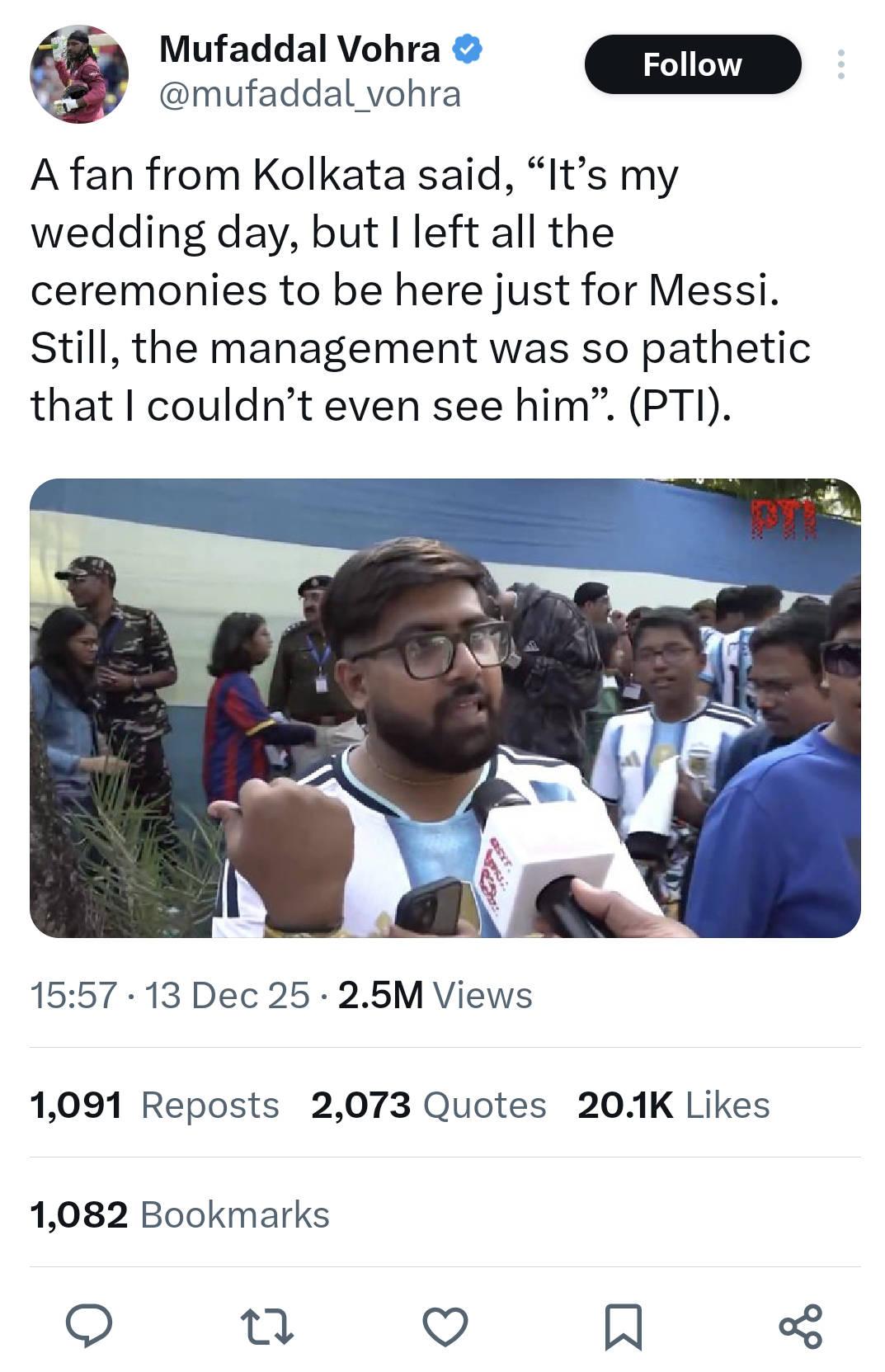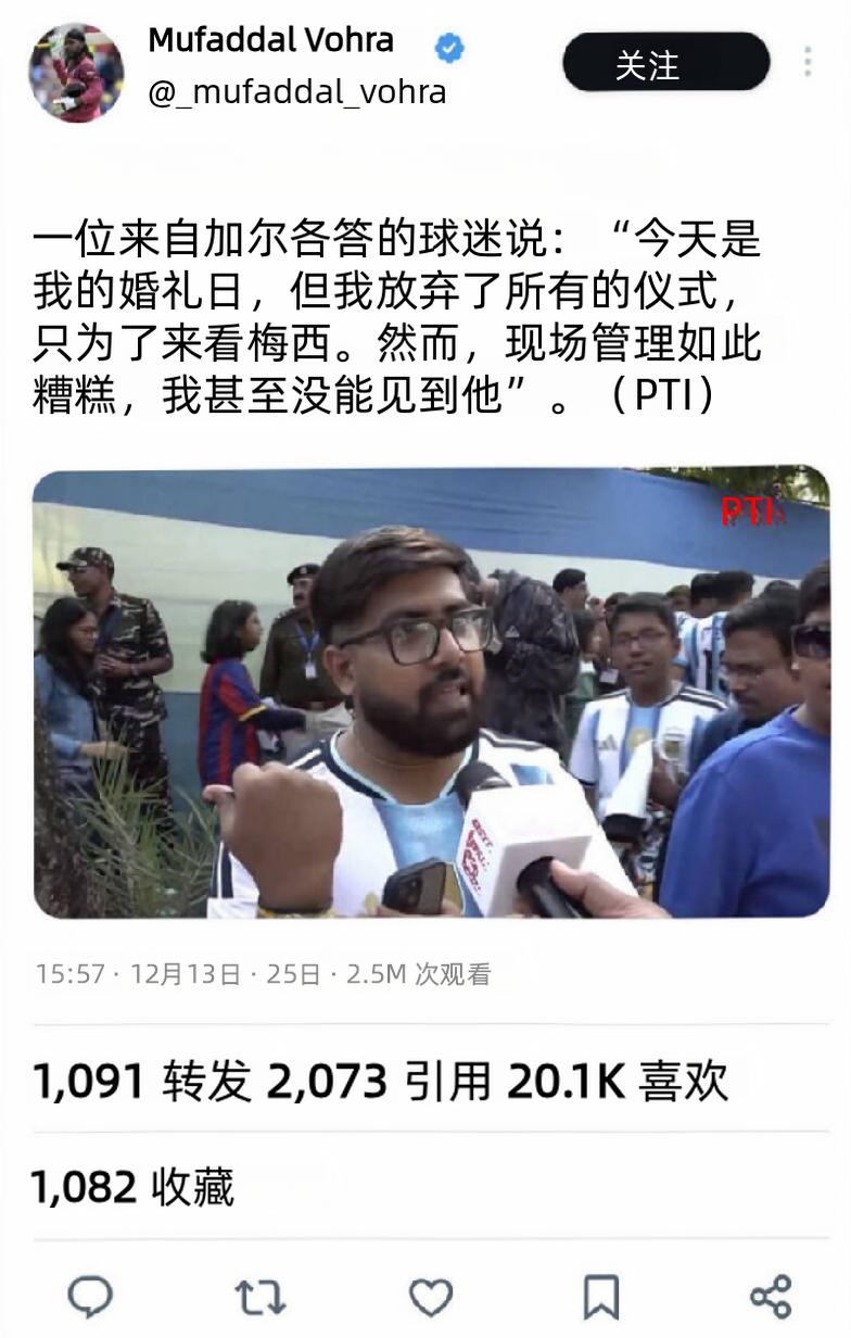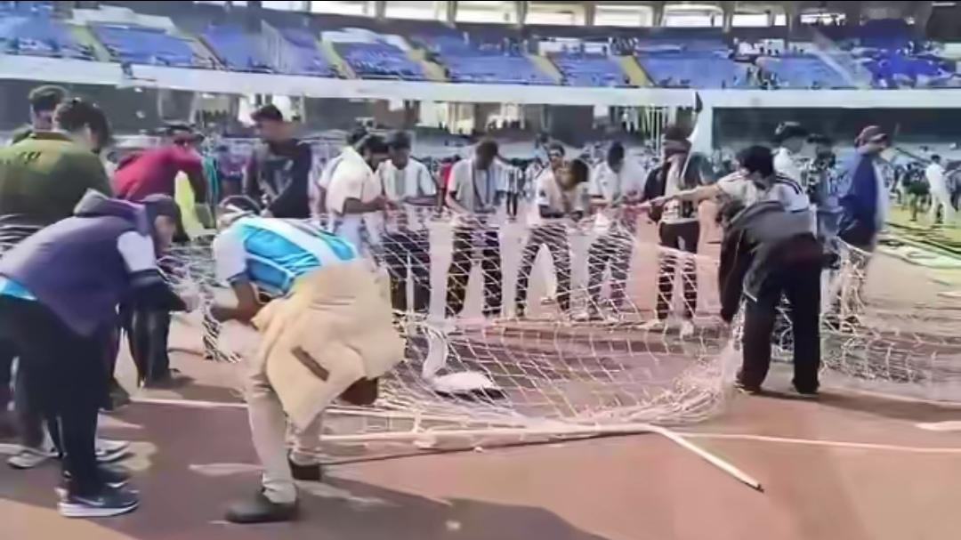 印度人的思维里总是住着一头“不占便宜就是吃亏”的恶魔。不管是做什么,总想从别人那里抢到什么或占据别人的东西。 一场明星足球赛下来,梅西在印度加尔各答盐湖体育场公开亮相时间极短,球迷说仅出现了10分钟左右。但印度官方及警方通报表示梅西活动持续了20-22分钟。宣传时说的会有45分钟的互动时间(包括绕场、表演等)。实际有效互动为零,梅西虽然在场,但被大量的政客、安保人员层层包围。后以人群混乱和安全隐患为由,简单挥手致意后,提前离场。 引发球迷不满,发生骚乱。 花费了12000卢比(约934元人民币,相当于普通印度人一个家庭半月甚至一个月的收入),最高的花了25000卢比(约1947元人民币)。印度意犹未尽,为了值回票价,印度人玩嗨了,把球网拆了。 要是把草坪的草也扒了带回去做菜,那才对味。 一个穿着梅西球衣的加尔各答球迷说,他婚礼日他都没参加就来看梅西,却人影都没看见。 西孟加拉邦首席部长已经为此道歉,并成立调查委员会。警方拘捕了活动组织者。 但12月14日,梅西将继续他在印度海得拉巴的行程。并与当地官员和小球员进行了传球互动。