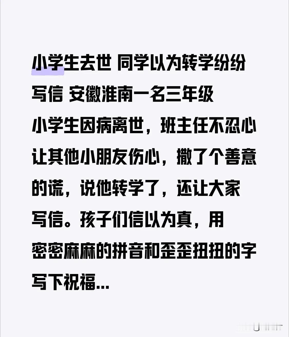 小学生去世 同学以为转学纷纷写信 安徽淮南一名三年级小学生因病离世,班主任不忍其他小朋友伤心,善意撒谎称其转学,还让大家写信。 同学们信以为真,用密密麻麻的拼音和歪歪扭扭的字写下祝福,“希望你早点回来看我们”“要记住我们噢”,纯真情谊满溢。买不起礼物的孩子,就带来自己最喜欢的橡皮、卡片。 老师看着这些,深知孩子再也回不来,此前还在办公室哭成泪人。她没说出残酷真相,怕孩子惶恐。这一幕令人动容,纸短情长,孩子间的友谊纯粹而珍贵。 学生不幸身亡 孩子去世
