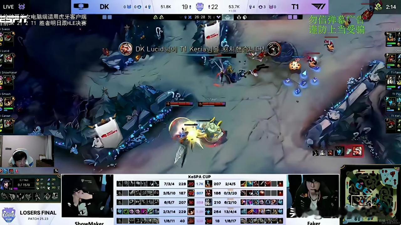 T1让二追三DK 0-2落后又怎样?T1绝境觉醒!第三局Peyz女警两度四杀收割,第四局Doran掘墓8分钟双杀带节奏,连扳两局将BO5拖入决胜生死局! 九千经济差的绝望深渊!DK鳄鱼双杀、阿狸团灭T1,胜券在握之际,T1吹响反击号角,厄塔汗团瞬间翻盘! Faker加里奥六次精准传送定乾坤,闪现越塔强杀核心!Peyz卡莉斯塔化身绝境战神,四杀收尾团灭DK,一人盘活全队!  Keria烈娜塔神级大招逆天改命!DK强秒Peyz未果反遭反打,T1一波1换4拿下大龙,将经济劣势彻底抹平! 高地塔前终局对决!T1五人抱团默契拉满,逐个击破DK防线,Faker加里奥大招进泉水庆祝,让二追三的传奇再度刻进LCK赛场!