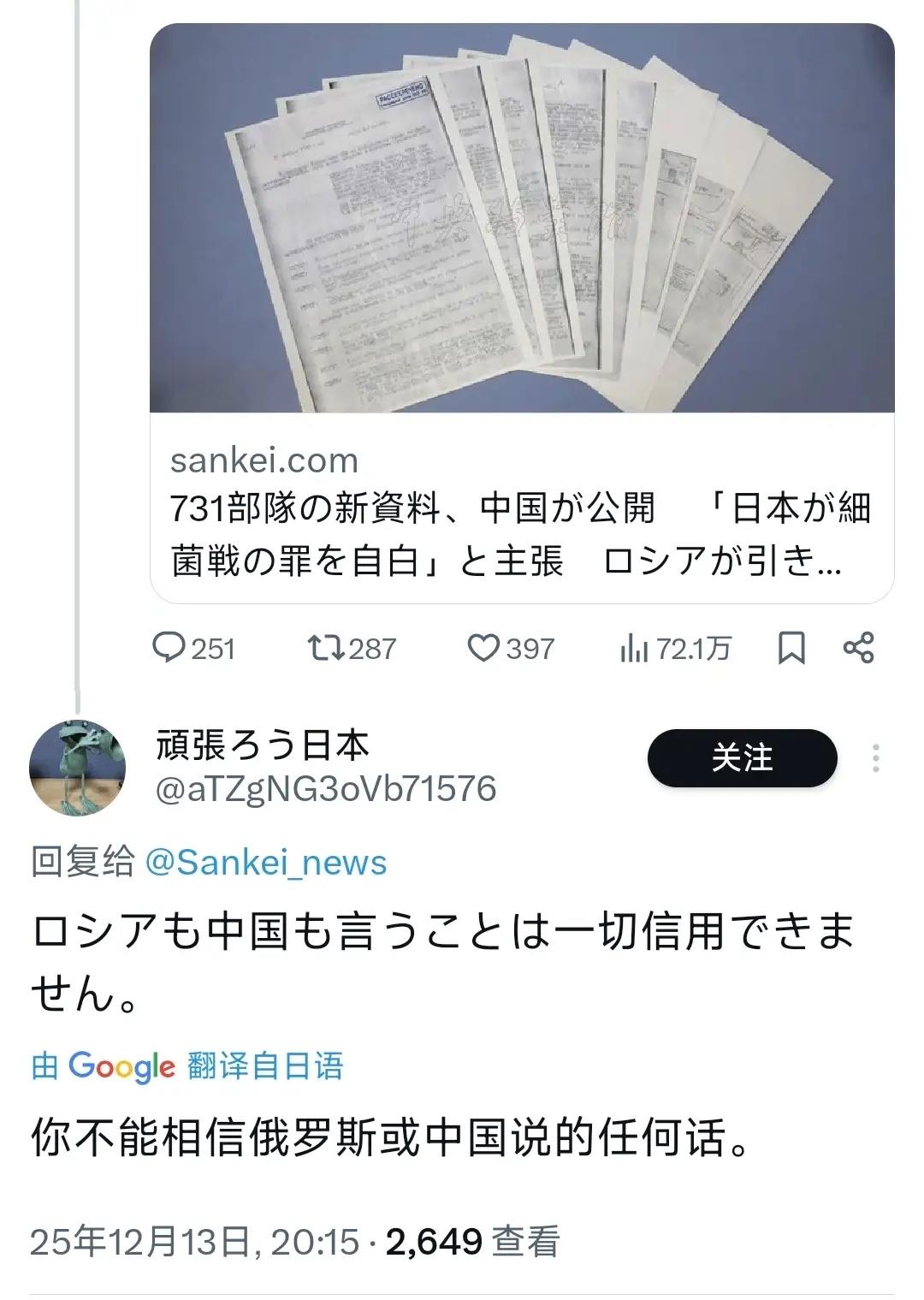据日媒报道,中国公布了由俄罗斯移交的731部队新文件。文件显示,受审小组成员完全承认了他们参与生物战的罪行。 该文章置顶留言,却相当恶心:你不能相信俄罗斯或中国说的任何话! 部分日本人发出如此“恶心”的言论,这背后是日本长期以来对历史教育的扭曲。在日本的一些教科书里,有意识美化侵略行径。这种教育方式培养出的一代代日本人,对真实的历史缺乏了解,才会出现这种罔顾事实、颠倒黑白的言论。 其实整个日本社会从来没有正视历史,也没有从历史中汲取教训,未来必将重蹈覆辙。历史不会因为他们的否认而改变,正义也不会因为他们的掩盖而缺席!