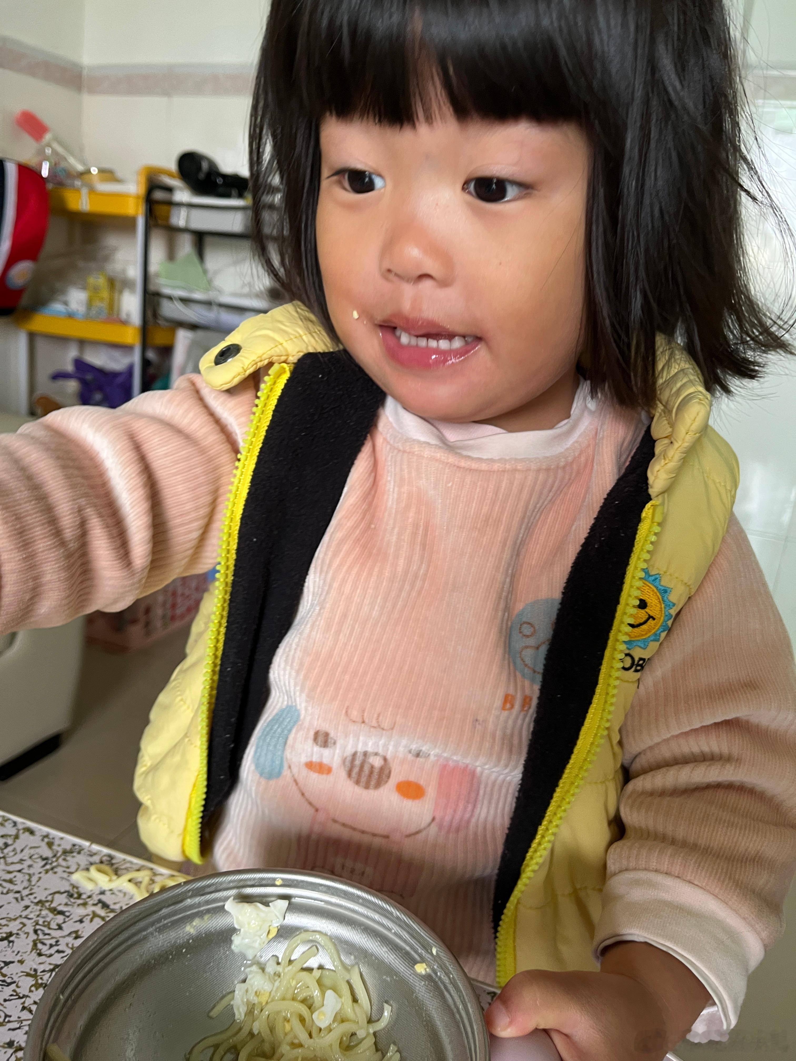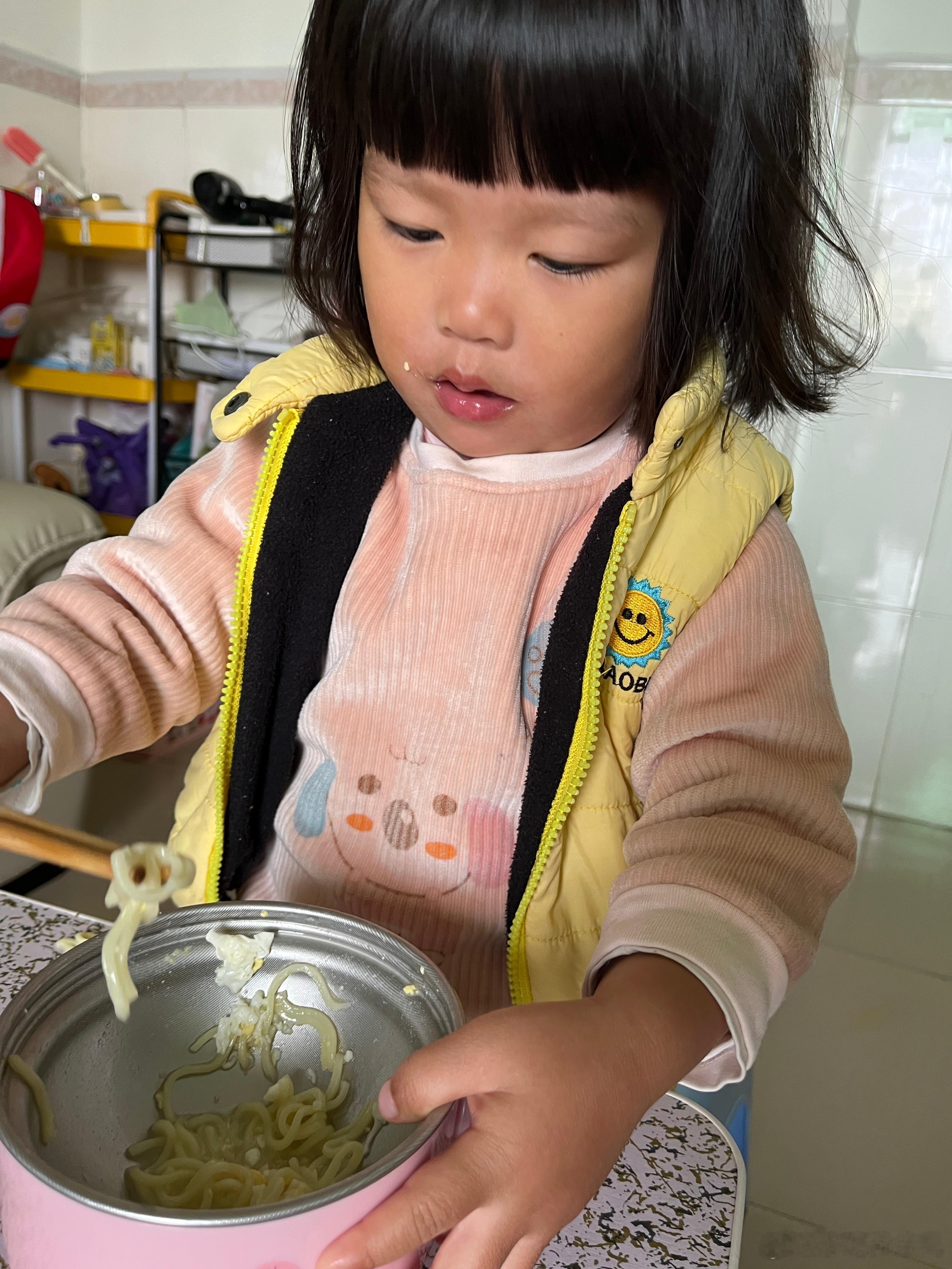 吃早餐了,一起床就说饿了,赶紧给她煮鸡蛋面,家里没青菜。猪油凝固了,好好看,雪白