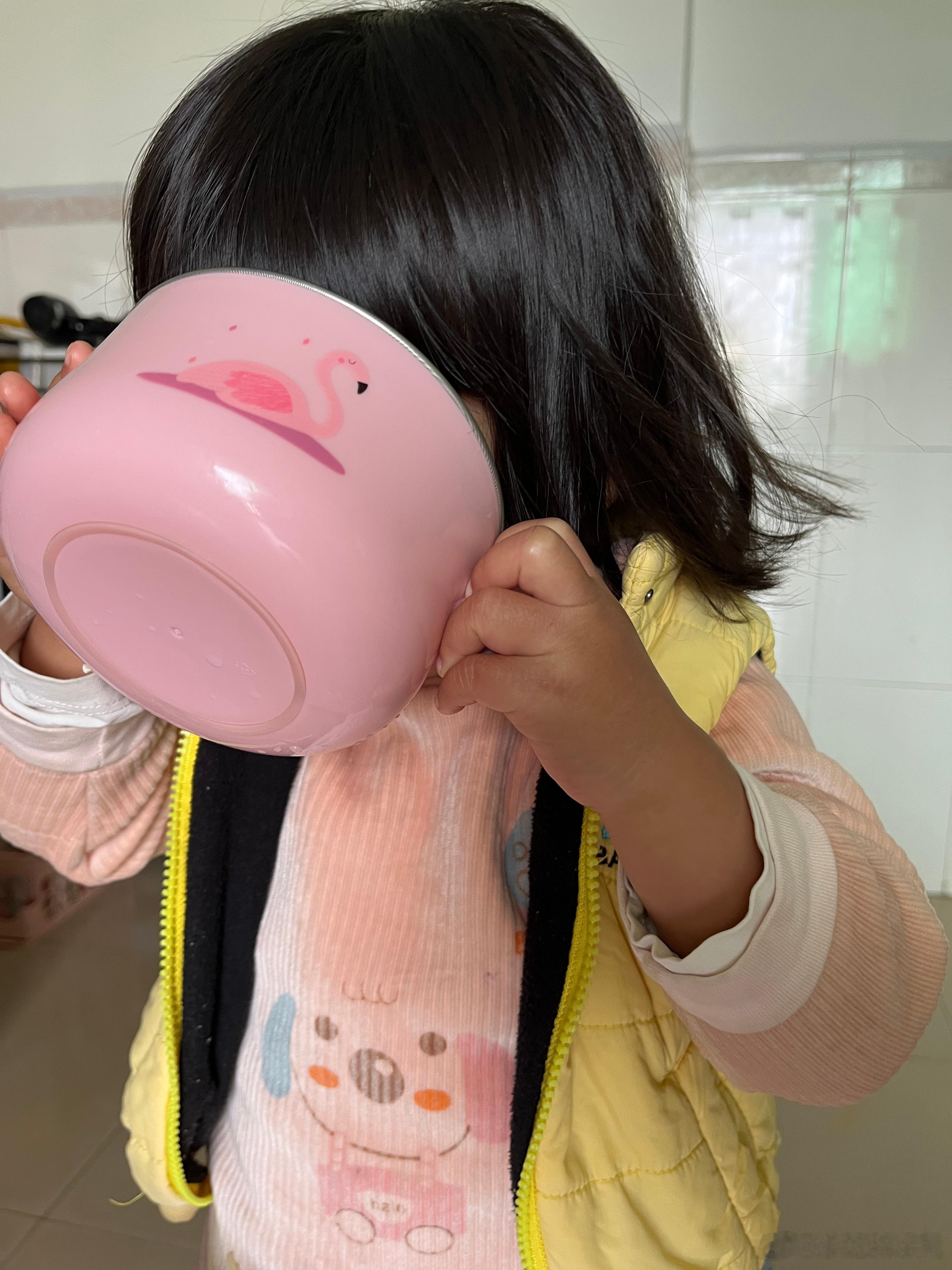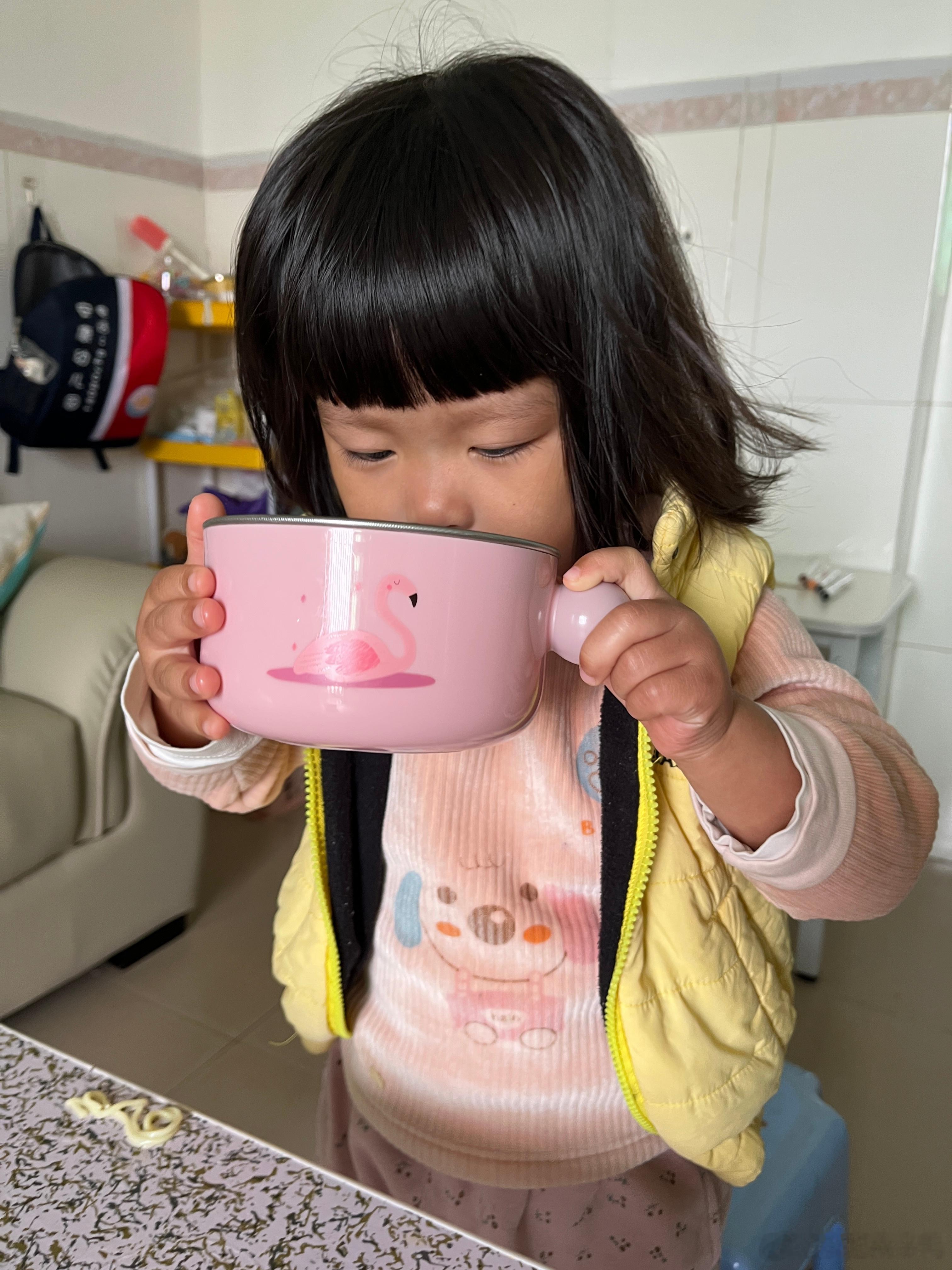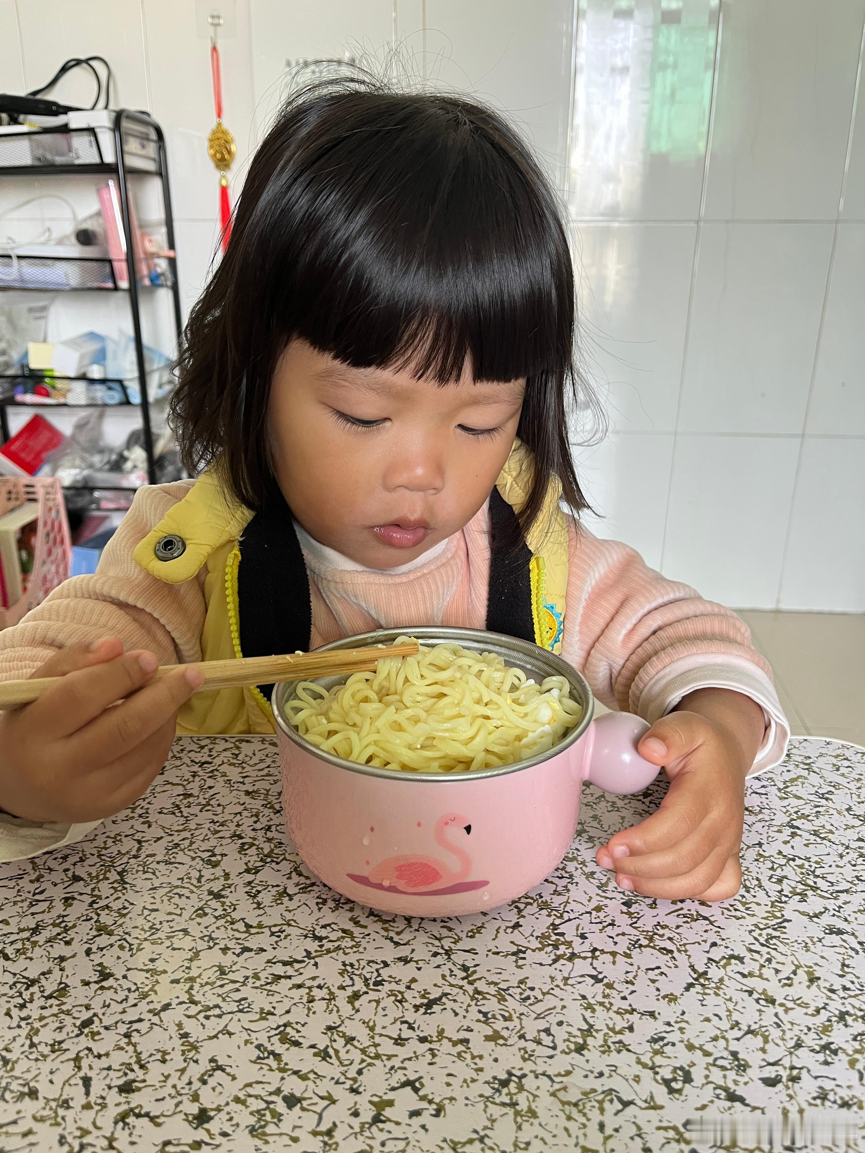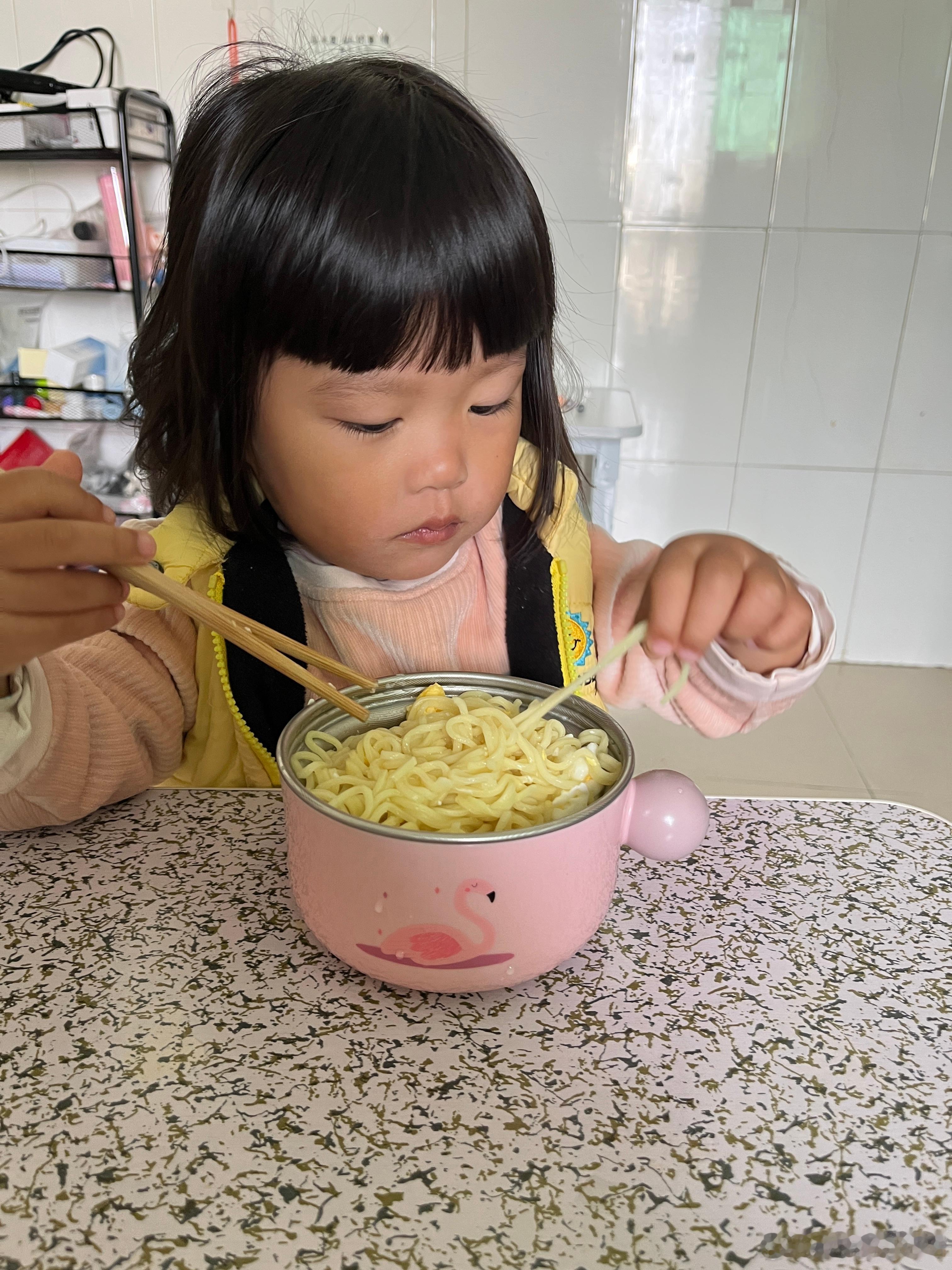 吃早餐了,一起床就说饿了,赶紧给她煮鸡蛋面,家里没青菜。猪油凝固了,好好看,雪白雪白的。一碗面吃得干干静静,真棒。
