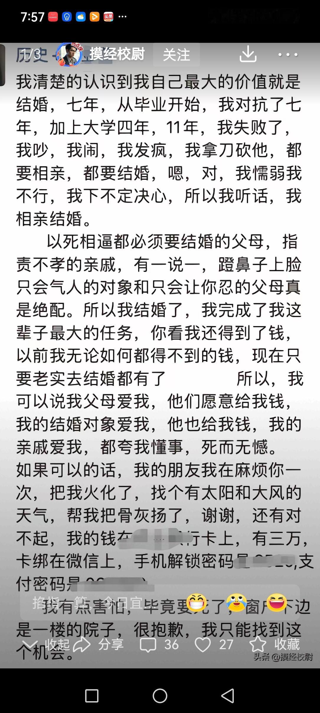 河南28岁女教师结婚当天跳楼身亡,上了热搜。 看到不少网友批评她的父母不该逼婚,可父母只是想让他们走后能多个照顾她的人。 如果余生都是一个人过,尽管快乐无忧。但年老后的孤独与无力,你却无法体会。 当你躺在病床上需要人照顾,当你手术需要家属签字,当你离开需要有人处理后事的时候,再想想年轻时候的任性到底值不值? 不过这个女教师也太偏执了,不想结婚,完全可以退婚离家出走就是,为什么非要拿自己的生命去较真呢? 从她遗书的字里行间也可以看出,她的未婚夫对她也不错,真不知道她是怎么想的?为了给父母一个交代,给男方留下了一个烂摊子,实属不该呀!