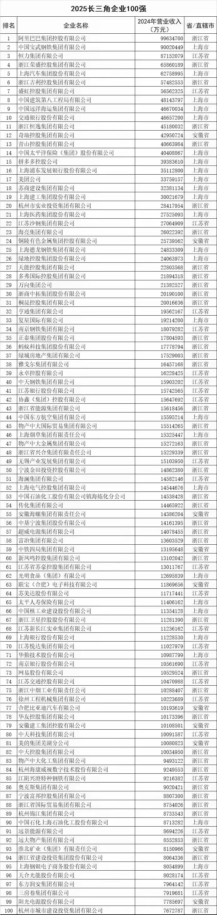 2025长三角企业100强 阿里巴巴再次荣登榜首 浙江省的名单是出现最多的 浙江省虽然在中国的国土面积微不足道的大,可是,这并不影响浙江的民企的发展。大家对此有些什么开法?以上仅供参考,属个人意见!内容材料源于网络