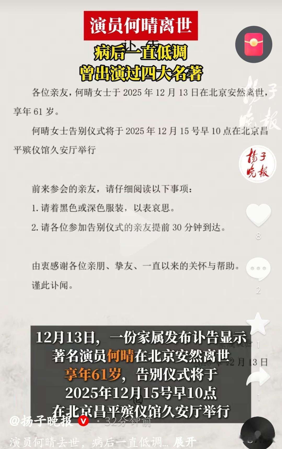 太让人难过了!唯一演遍四大名著的女演员何晴,12月13日在北京离世了,享年61岁。 她的每个经典角色,真的刻进了几代人的记忆里。1986年《西游记》里,她是“四圣试禅心”中娇俏灵动的怜怜,一眼就让人难忘;1989年《红楼梦》中,她演的秦可卿,妩媚又带着哀愁,美到让人惊艳;1994年《三国演义》里,她是温婉端庄的小乔,和周瑜的搭配成了经典;1997年《水浒传》中,她饰演的李师师,风情万种又透着清醒,成了剧里亮眼的一抹亮色。 能把四大名著里的角色都演遍,至今没第二个人能做到。她的古典气质是骨子里的,每个角色都像从书里走出来的一样。如今这位“古典第一美女”离开了,但那些经典影像永远留在了我们心里,一路走好!