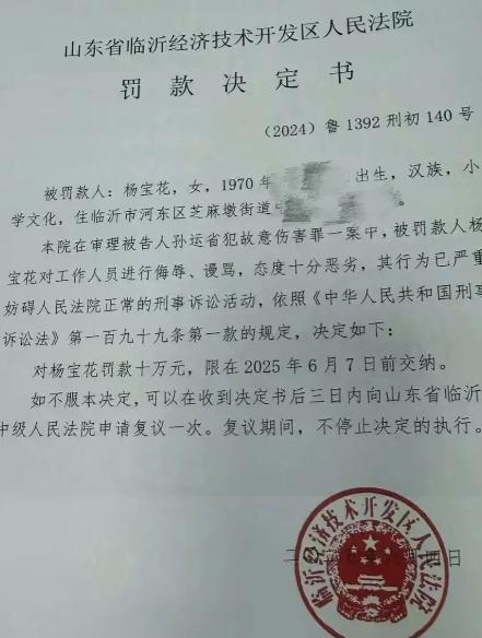 山东临沂,女子丈夫被同村人打成轻伤二级,事后对方被判拘留3个月,赔偿2.5万,女子不满判决结果,跑到法院大厅,逮着承办法官质问她为啥判这么轻?并大喊一句:判得没良心!哪成想,女子当天就收到法院决定书,她因谩骂工作人员被罚款10万,拘留15天,女子彻底懵了。 事情要从 2023 年说起。王永来因村里纠纷,与同村另一名村民孙运省 发生冲突。随后,孙运省竟然拿起羊角锤朝王永来头部挥去。 那一击,沉重、野蛮。王永来被打成轻伤二级——不是轻微磕碰,而是经鉴定,属于“轻伤二级”。 这个鉴定,意味着身体伤害、意味着一段不短时间的痛苦恢复,还有对家庭、对劳苦生活的影响。 2025年6月3日,法院对孙运省作出判决:判处拘役三个月,并赔偿王永来 2.5390 69 万元。 法庭合议后宣判,纸面上,似乎有了结果——然而,对王永来一家,这个“结果”远不能平息他们的愤怒与失望。 对于一个靠土地和体力过日子的农家,几万块钱的赔偿也许不轻,但对被打成年轻人甚至中年人的身体、健康和尊严而言,这样的量刑、这样的赔付——难免觉得轻。 听说这个判决后,杨宝花愤怒了。她不是从法学院毕业的知识分子,但她知道——丈夫被人用羊角锤打成轻伤,她家人的身体和尊严被践踏,怎么可能简单几个月拘役就算了? 也许是愤怒,也许是积怨。她最终抱着“不服气”的心态,决定去法院问个明白。她希望为丈夫讨个说法,为家庭讨个公道。 2025 年 6 月,杨宝花带着刚出炉的判决书,走向承办法官办公室——她要让对方听她的声音。 她大声发问:“为什么判得这么轻?如果是你的丈夫被别人打成这样,你也会这样判吗?谁这么判决,谁就没有良心!” 她承认,她当时情绪激动,嗓门大;但她坚称,她没骂人,没侮辱法官 — 她只是质问、公理和良心。她说,她只是想要一个合理的解释,一个让她觉得这个判决是公平的理由。 然而,她的话语,却在法院大厅里引发轩然。数名法警走来,将她带走。 有人记录,有人拍照,有人低声交谈。她被带到一旁,有人要让她签字,有人递过罚单与拘留决定书:罚款 10 万元,拘留 15 天。 拘留、罚款,对一个普通农村家庭意味着什么?对一个靠田地和体力生活的家庭而言,10 万元,是一笔巨款。对 55 岁的农妇,自身也不富裕。 当天夜里,她的女儿惊闻此事,心急如焚:“妈怎么会惹上这样的麻烦?” 乡亲们也来安慰、议论——有人说“村里人文化都不高,表达情绪方式有限”,有人觉得“判得太轻了,你这不是为老伴伸冤吗?” 可更多的是对处罚过重的不满和对司法不公的疑惑。 第二天,她的女儿不得不四处筹钱。村里能借的借,亲戚能凑的凑,加上邻居朋友一点一点帮助,总算在 6 月 18 日将 10 万元分两次转给法院。18 日傍晚,她从拘留所被放出来。 那一刻,她腿有些发软,肩膀有些抖——不仅因为拘留带来的身体与心理疲惫,也因为她依然不明白:一句“谁这么判决,谁就没有良心”——为什么要付出这样的代价? 事件被爆出,不仅在本地,在全国也引起轩然大波。 许多网友在网络上讨论:一个农村老年妇女,文化水平不高,她用自己能理解的方式对判决表达不满,结果却被罚款、拘留,太重了! 很多人说,这不是维持法庭秩序,而是“官威”。有人甚至揶揄道:打人用羊角锤都只判三个月,还赔 2 万多;质疑判决一句话,就罚十万。天地良心在哪? 不少法律界人士也表达了异议。正如一些评论指出,这种处罚明显与法律规定不符,不该同时用罚款和拘留两种处罚;罚款额度有限,却被施以天价。 有人建议:即便当事人对判决不满、不服,也应通过依法复议、上诉,而不是到法院当面质问——更不该因此被当作扰乱法庭秩序重罚。 2025 年 9 月 19 日,临沂经济技术开发区人民法院(下称“经开法院”)发布通报:经核查,该院之前对杨宝花作出的 10 万元罚款处罚决定,在适用法律上存在错误。 法院决定:撤销对其的罚款决定,退还罚款及利息,并向当事人诚恳道歉。 通报中还称,将“依法依纪追究相关人员责任”。也就是说,这个处罚,不仅被认为不当,还可能涉及内部程序、责任认定的问题。