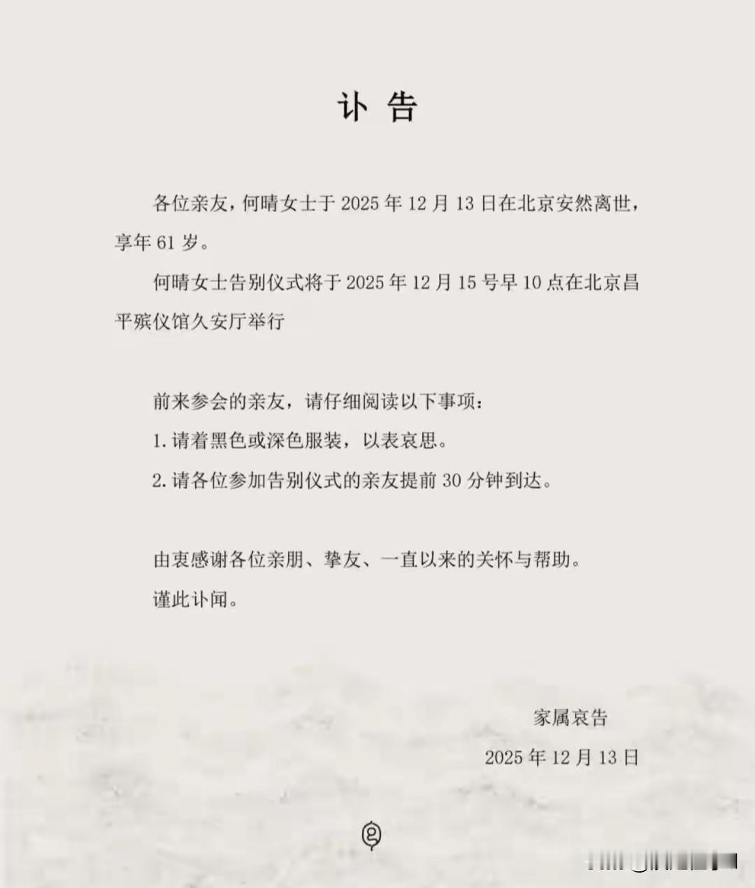 著名演员何晴去世,享年61岁。 家属发布讣告,告别仪式定于12月15日在北京昌平殡仪馆举行。电影博主余泳证实消息,晒出黑白照悼念,称何晴生前希望低调,不愿公开病情。 何晴是唯一演遍四大名著的女演员,从《西游记》的怜怜到《水浒传》的李师师,每个角色都深入人心。她还演过《青青河边草》的华又琳、《澳门的故事》的欧迪丝,戏路宽泛,演技扎实。 近年她较少露面,最后一次公开亮相是在某综艺节目,状态不错,没想到突然传出噩耗。网友猜测可能是旧疾复发,但家属未透露具体病因。 她的离世让不少观众感慨,那些经典角色已成绝唱。评论区一片唏嘘,有人感叹“仙女归班”,也有人惋惜“美人如玉,奈何天妒”。