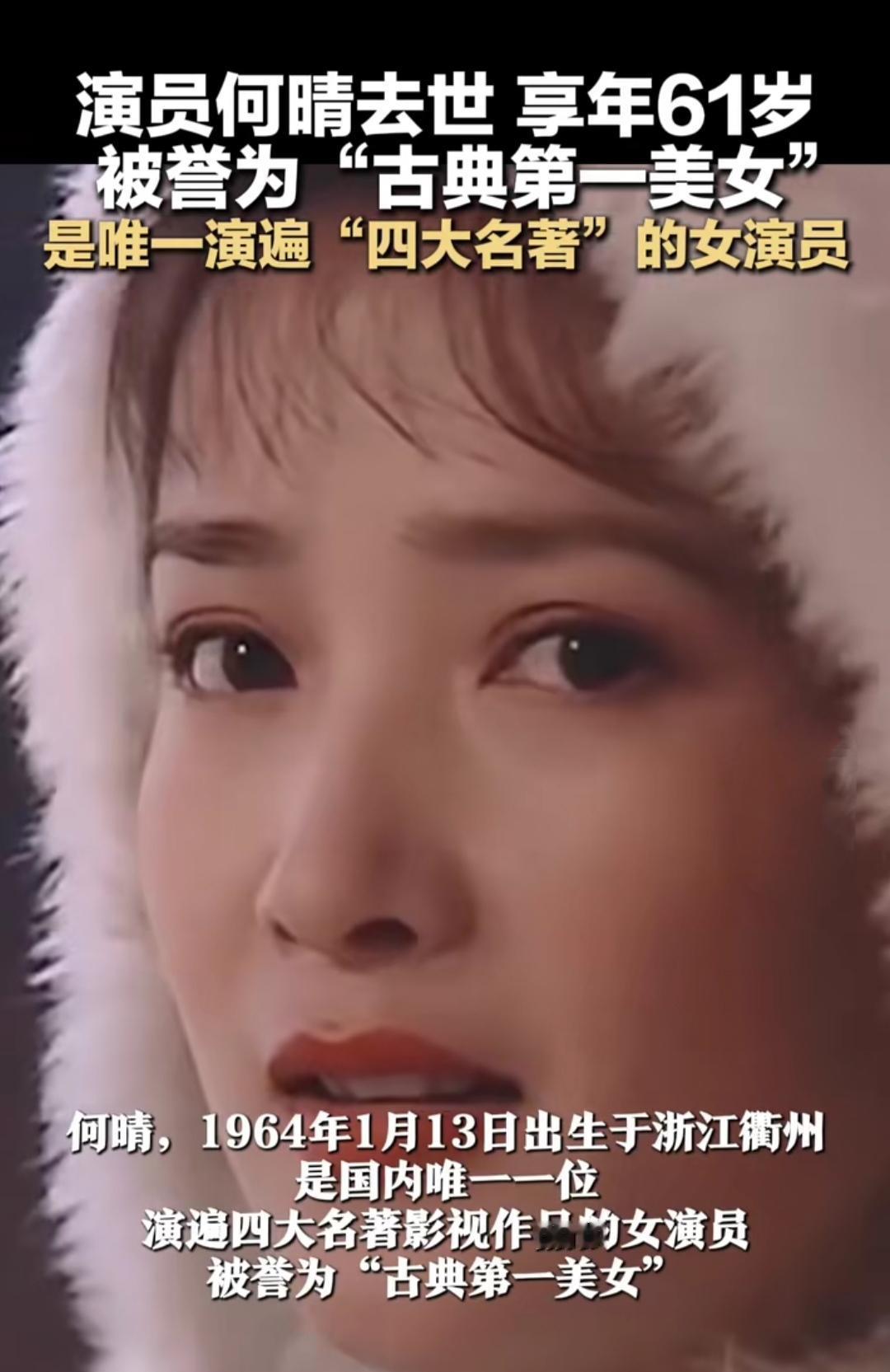 刷到“古典第一美女”何晴去世的消息时,手里的手机突然顿了一下——这个承包了童年古装记忆的女人,终究还是离开了。61岁的年纪,不算长也不算短,却把古典美刻进了几代人的心里。 她是唯一演遍四大名著的女演员:《西游记》里灵俏的怜怜,《红楼梦》中温婉的秦可卿,《三国演义》里倾城的小乔,《水浒传》里风情的李师师。没有夸张的滤镜,仅凭一双含情眼、一身书卷气,就把每个角色演活了。 现在的古装剧不缺美女,却少了那份天然的古典韵味。何晴的美,不是刻意雕琢的精致,而是从骨子里透出的温婉与灵动,那是属于老戏骨的敬业与纯粹——为了贴合角色反复揣摩剧本,哪怕是小配角也全情投入。 她的离开,不仅是一位演员的落幕,更是一个古典美学时代的告别。愿天堂也有诗词歌赋,愿这位“古典第一美女”,在另一个世界继续惊艳时光。