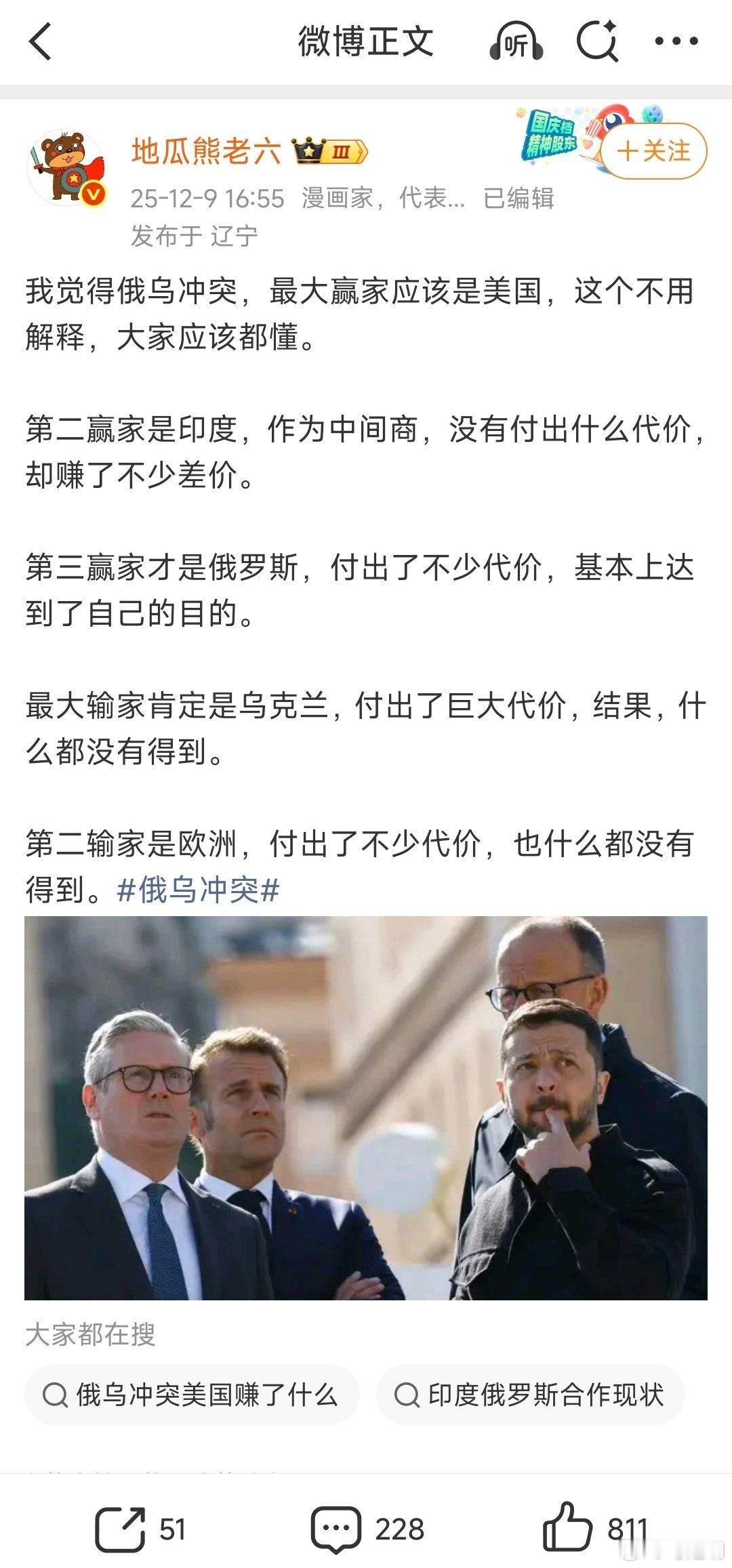 地瓜熊老六刘老师精致的算了一笔账,美国、印度和俄国是俄乌战争三个受益国。乌克兰和欧洲是最大的受损国。只是不知道这样计算的公式是啥?是不是又拿俾麦斯说的“真理在大炮射程内”作为真理?这句话是变异体,原话是胜利站在大炮多的一方。当年希特勒、东条英机的大炮不仅是射程远,炮火覆盖范围也很大。结果一个自杀,一个上了绞刑架。我个人觉得,为侵略者张目,是屎上雕花,是懦弱的表现。当本民族遇到同样危机的时候,他们几乎都是“识时务者为俊杰”的投降派,比如贝当元帅和汪精卫。算账容易,良心上不了台账,就是笔蔑视生命的糊涂账。正义与底线,从来不是“谁的拳头打”下的算计。